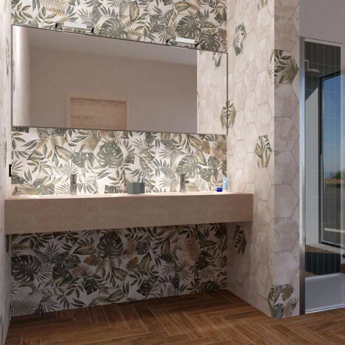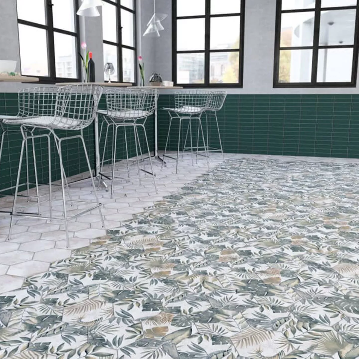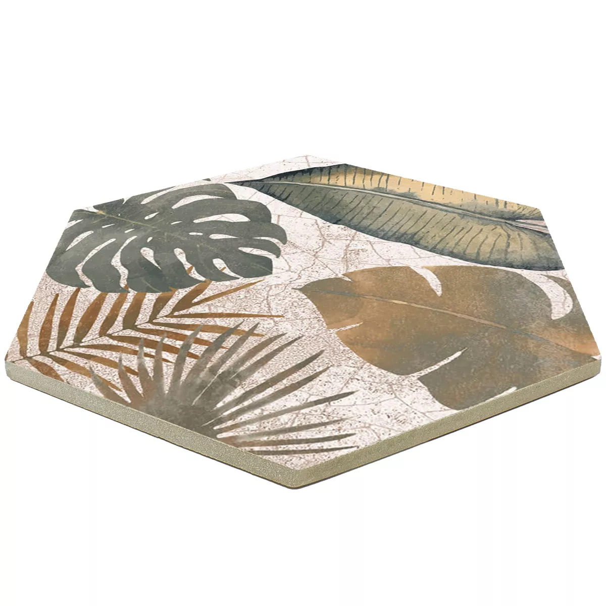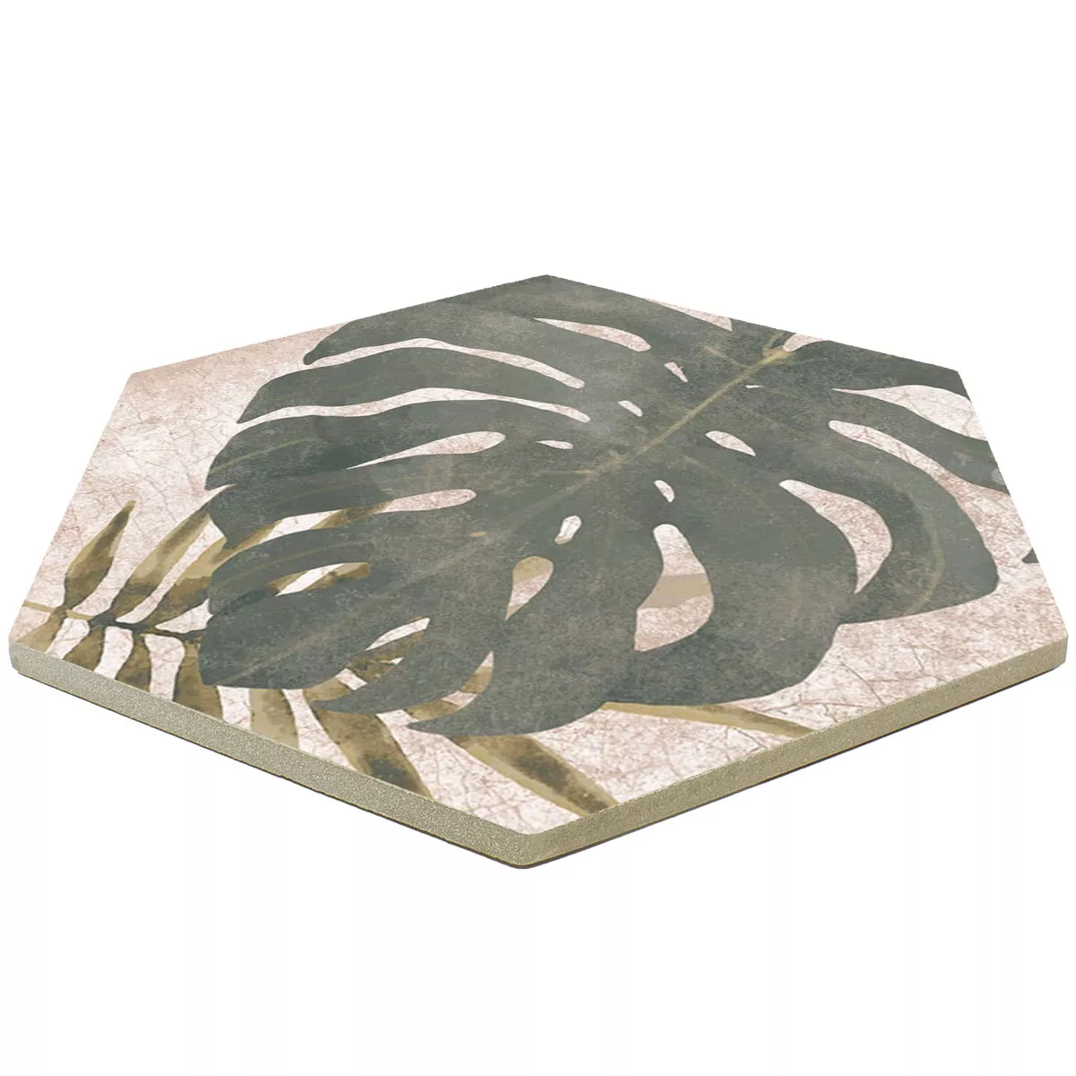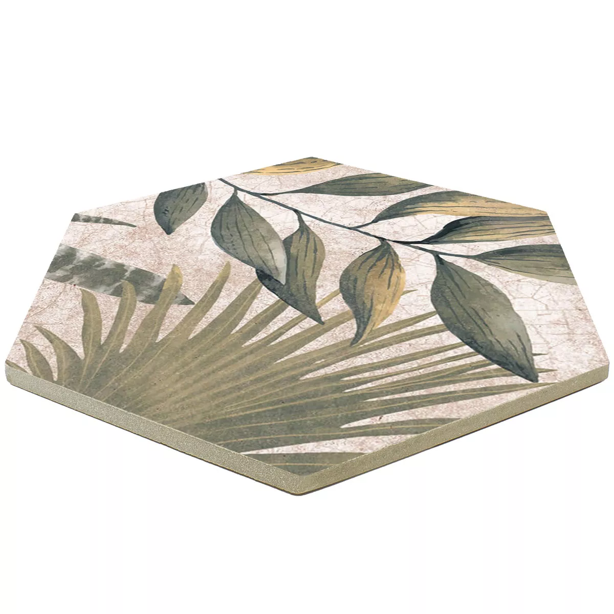 Das markante Hexagon-Format in Kombination mit dem dezenten Blumendekor verleiht Ihren Wänden und Böden eine einzigartige Ästhetik. Die Fliesen sind in einer Größe von 22,5x25,9cm erhältlich und sind in den Farben Grün und Beige verfügbar, die für ein harmonisches und beruhigendes Ambiente sorgen.