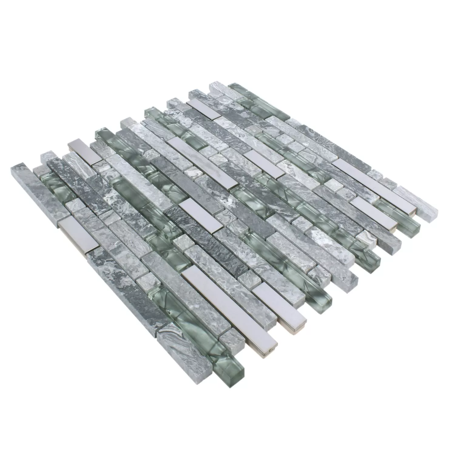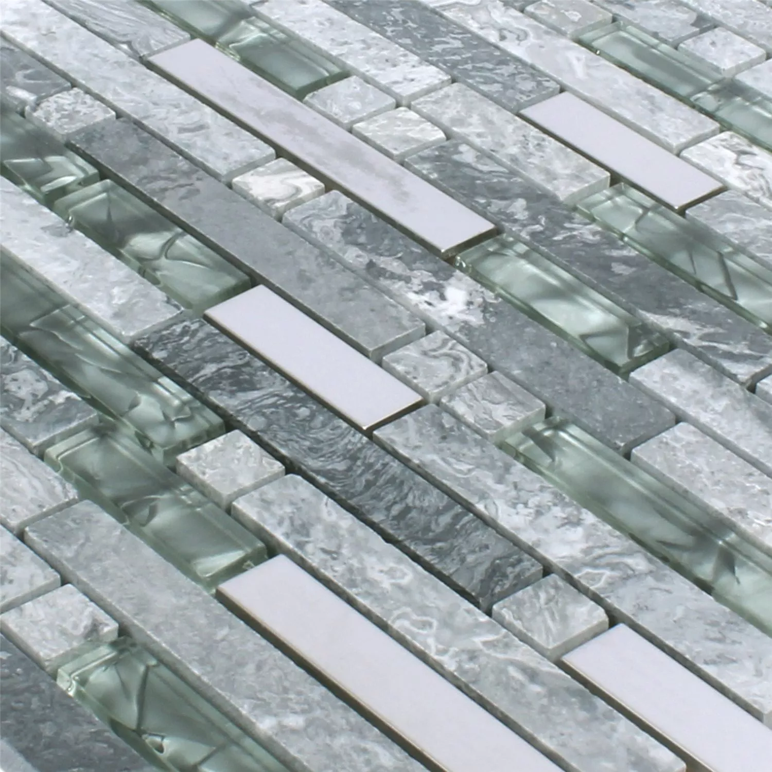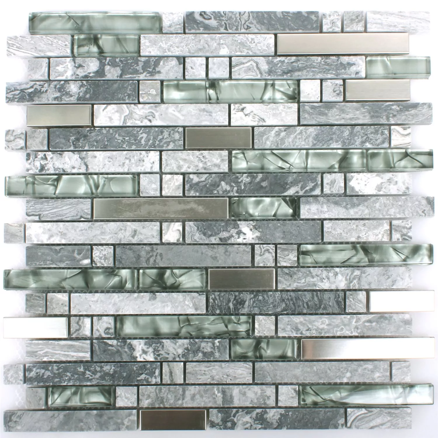 Gebürstet, glänzend und poliert ist die Mischung dieser ausgefallenen Mosaikfliesen. Die Mischung der Materialien ist im asiatischen Stil und grau gehalten. Insgesamt kommen Natursteine, Glas und Edelstahl zur Verarbeitung. Alle Teile sind rechteckig, die Steine sind naturbelassen. Das Glas schimmert glänzend grau neben dem leicht gebürsteten Edelstahl. Alle Fliesen sind auf einer Matte aufgetragen und können so ganz leicht verarbeitet werden. Eine Kombination mit mehreren Matten ist problemlos möglich. Geeignet sind die Mosaikfliesen vor allem als Wandbelag.