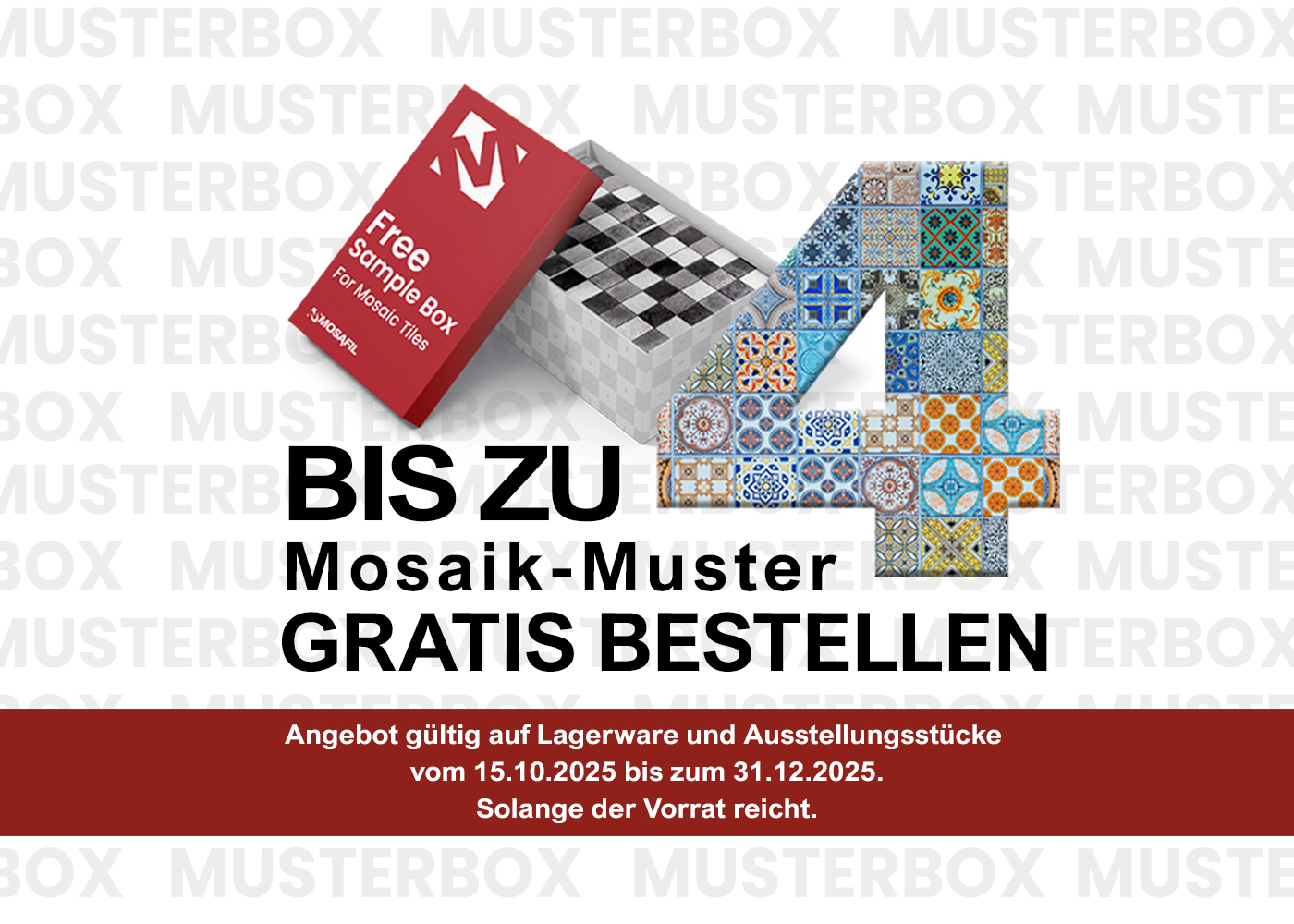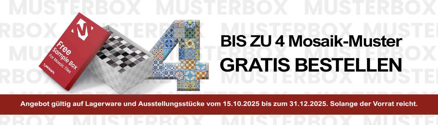 Wir führen ständig eine große Auswahl an hochwertigen Mosaiken und Fliesen für Bad und WC, Pools, Flure, Wohnräume sowie Terrassen und Gehwege. Bei uns finden Sie verschiedene Fliesen, Wandfliesen, Bodenfliesen, Feinsteinzeug, Bordüren und Glasmosaik wie Mosaikfliesen, Naturstein, Mauerverblender, Mauerverkleidung, Schwimmbad-Mosaik, Flusskiesel, Mosaike mit Holzoptik, Metall-Mosaik, Natursteinmosaik, Edelstahl-Mosaik, Alu-Mosaik, Marmorbruch, Marmor-Mosaik, Küchenmosaik, Küchenfliesen, Natursteinfliesen, Travertin, Schiefer, Badfliesen. Bad-Mosaik mit vielen Gestaltungsmöglichkeiten. Lassen Sie sich von den vielfältigen Formen, Materialien und Farben inspirieren! Stöbern Sie rund um die Uhr in unseren Produktkategorien, die wir kontinuierlich mit neuen Produkten aktualisieren. Bestellen Sie einfach von zu Hause aus Ihre Wunschfliesen oder -Mosaiken als Muster oder gleich in der benötigten Menge. Wir liefern schnell und sicher europaweit. Wir beraten Sie gerne persönlich und erstellen mit Ihnen gemeinsam maßgeschneiderte Angebote.