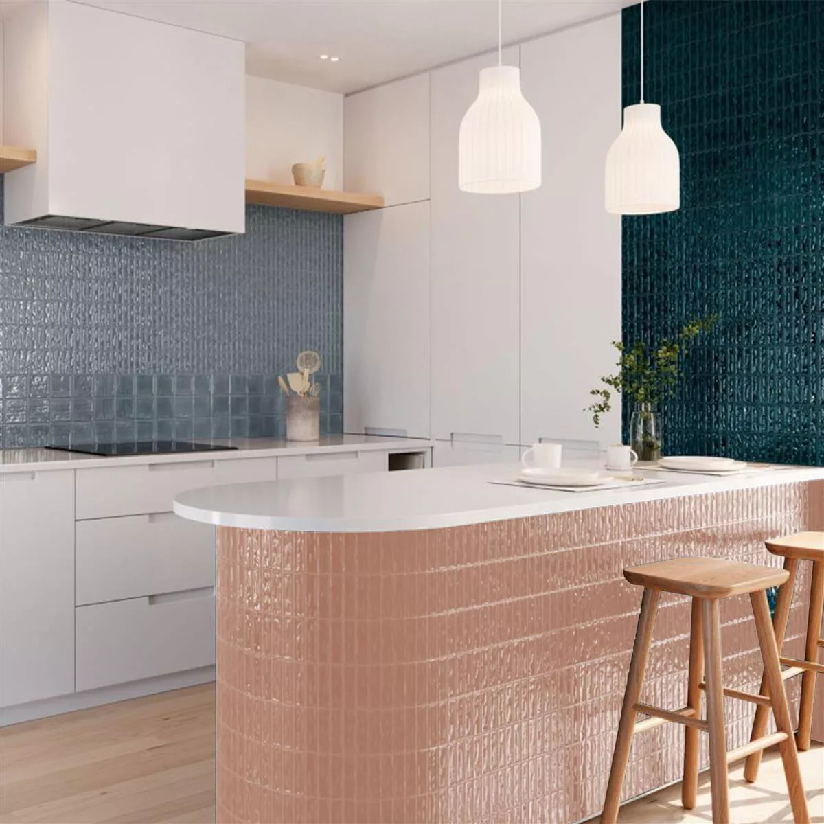Bringen Sie mit unseren Wandfliesen Verbania Stäbchen Glänzend Gewellt Rosa in der Größe 20x20cm eine charmante Vintage-Ästhetik in Ihr Zuhause. Diese glasierten quadratischen Fliesen mit gewellter Oberfläche und glänzendem Finish verleihen Ihren Räumen eine elegante Note in zartem Rosa. Jedes Paket umfasst 1m² und wiegt 13,25 kg, mit insgesamt 25 Fliesen pro Paket.