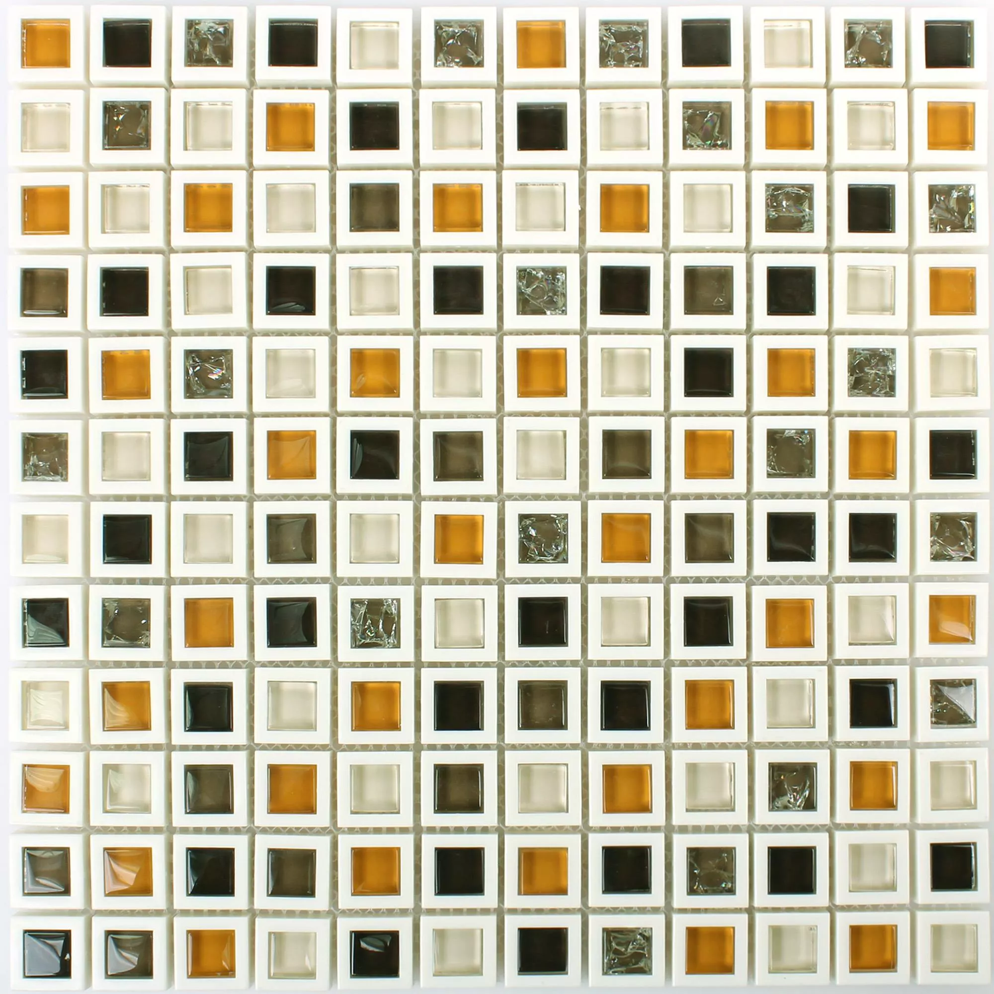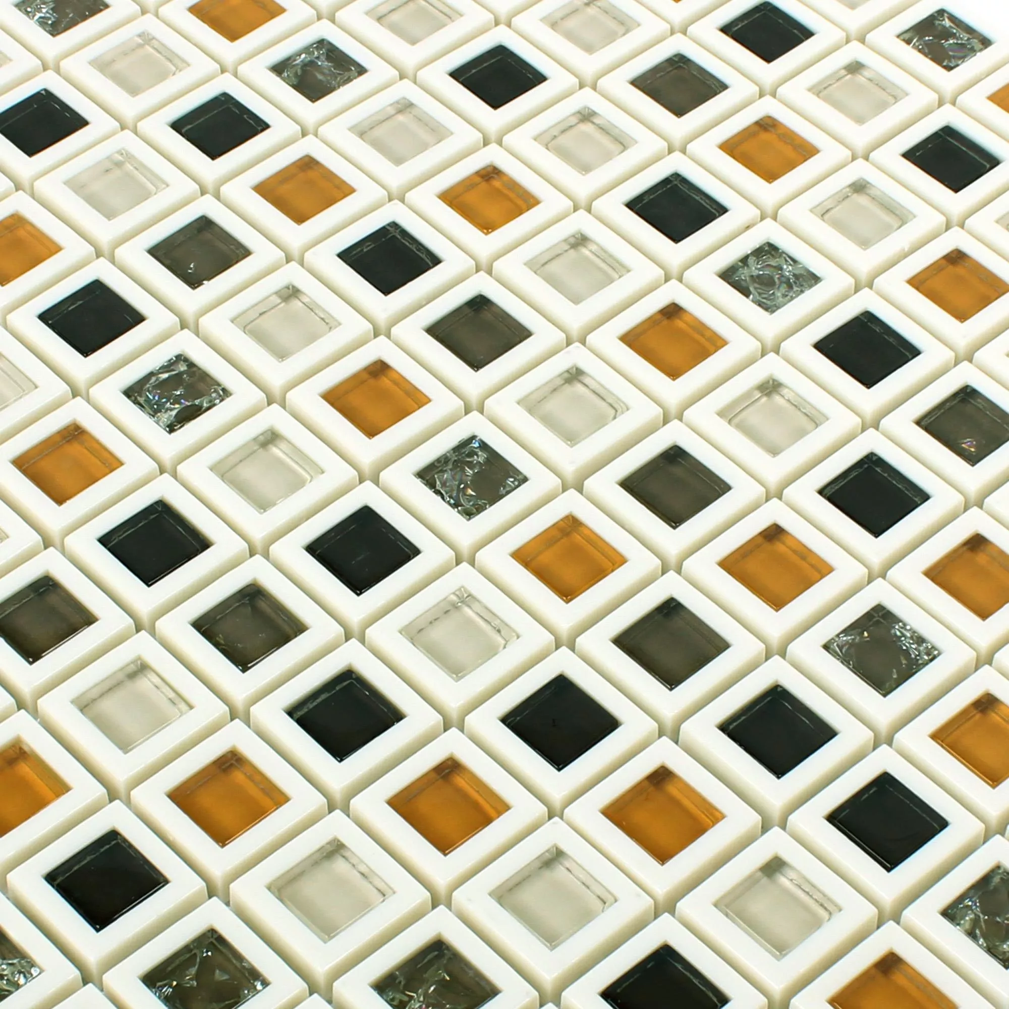 De mozaïektegels in de groen-witte verpakking combineren helder wit met accenten in verschillende tinten groen, waarvan sommige neigen naar blauwachtig. In de andere lichte variant wit, donker en geelbruin glas zetten kleur highlights. De individuele wandtegels worden elk omzoomd door een wit kader.
