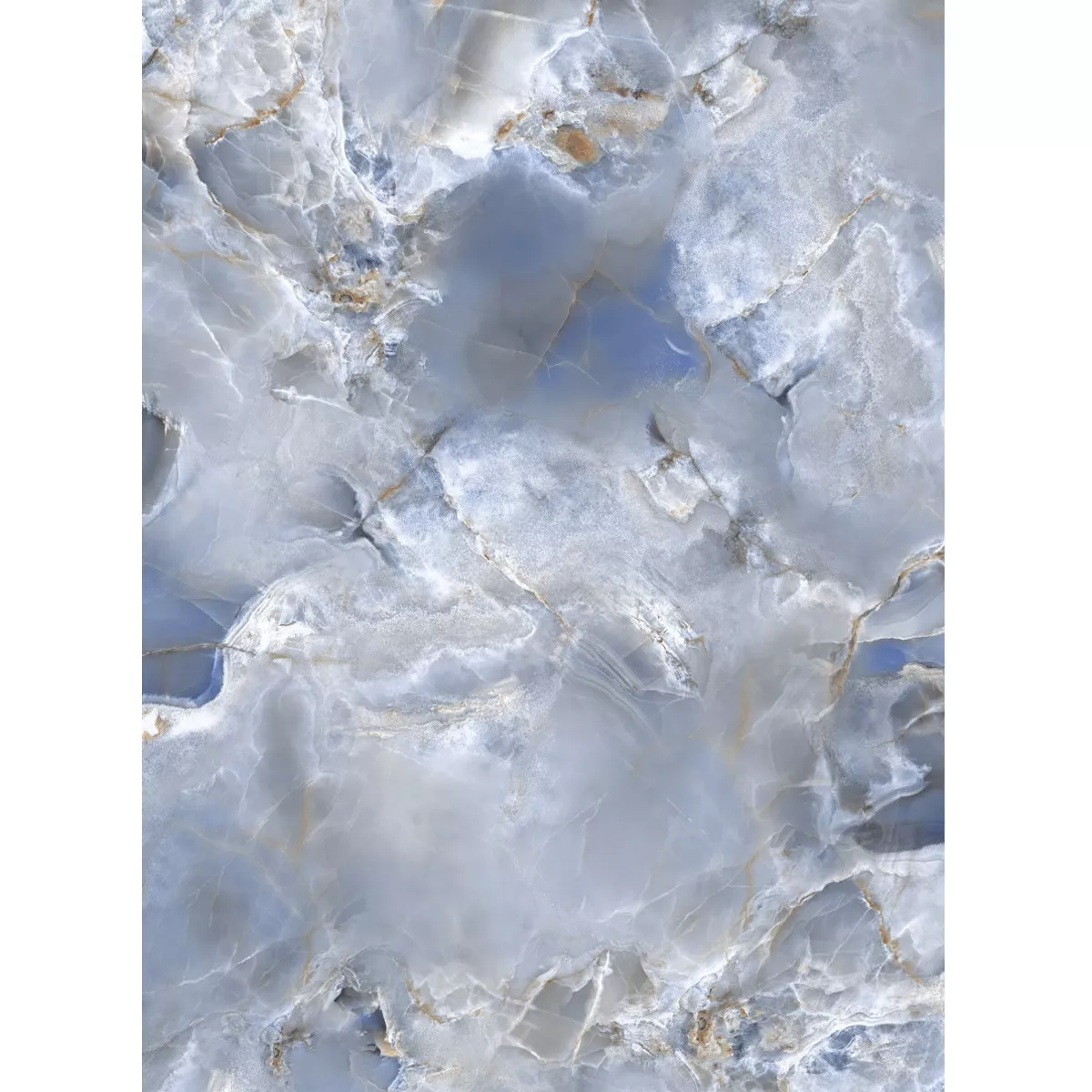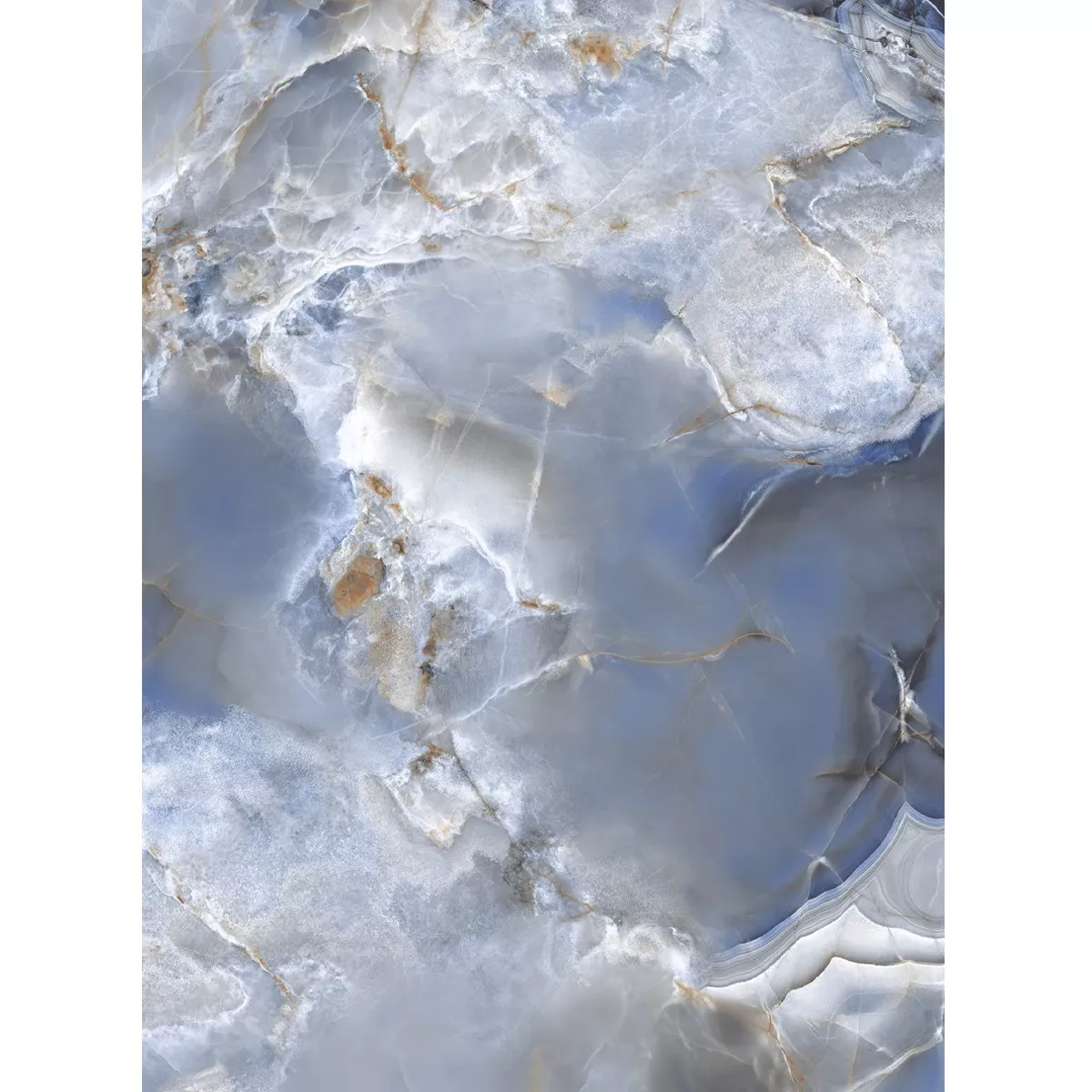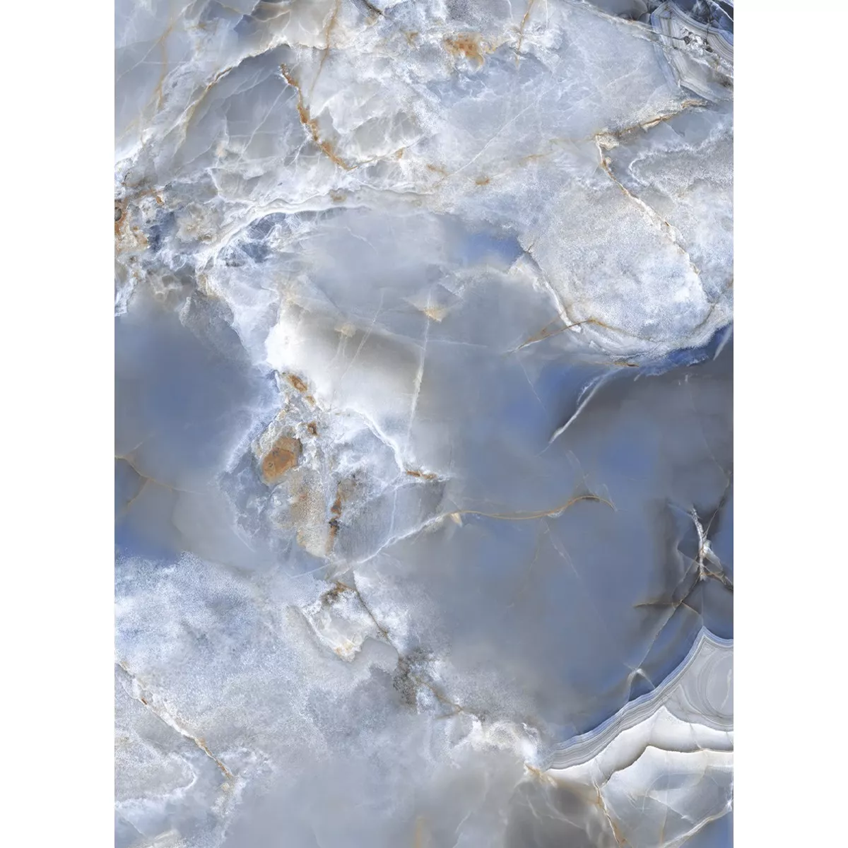 La couleur bleue éclatante et la surface polie, qui accentuent l'aspect marbré, créent un effet saisissant. Les carreaux, d'une longueur impressionnante de 120 cm, ajoutent profondeur et élégance à la décoration.