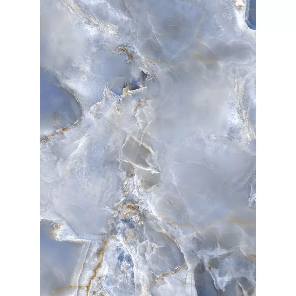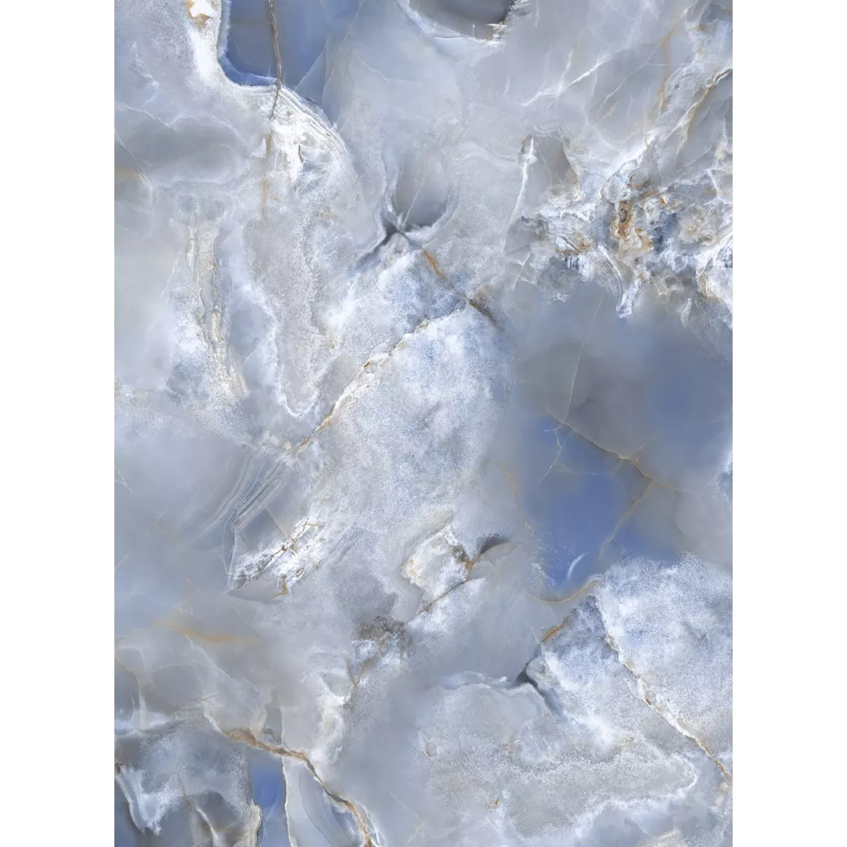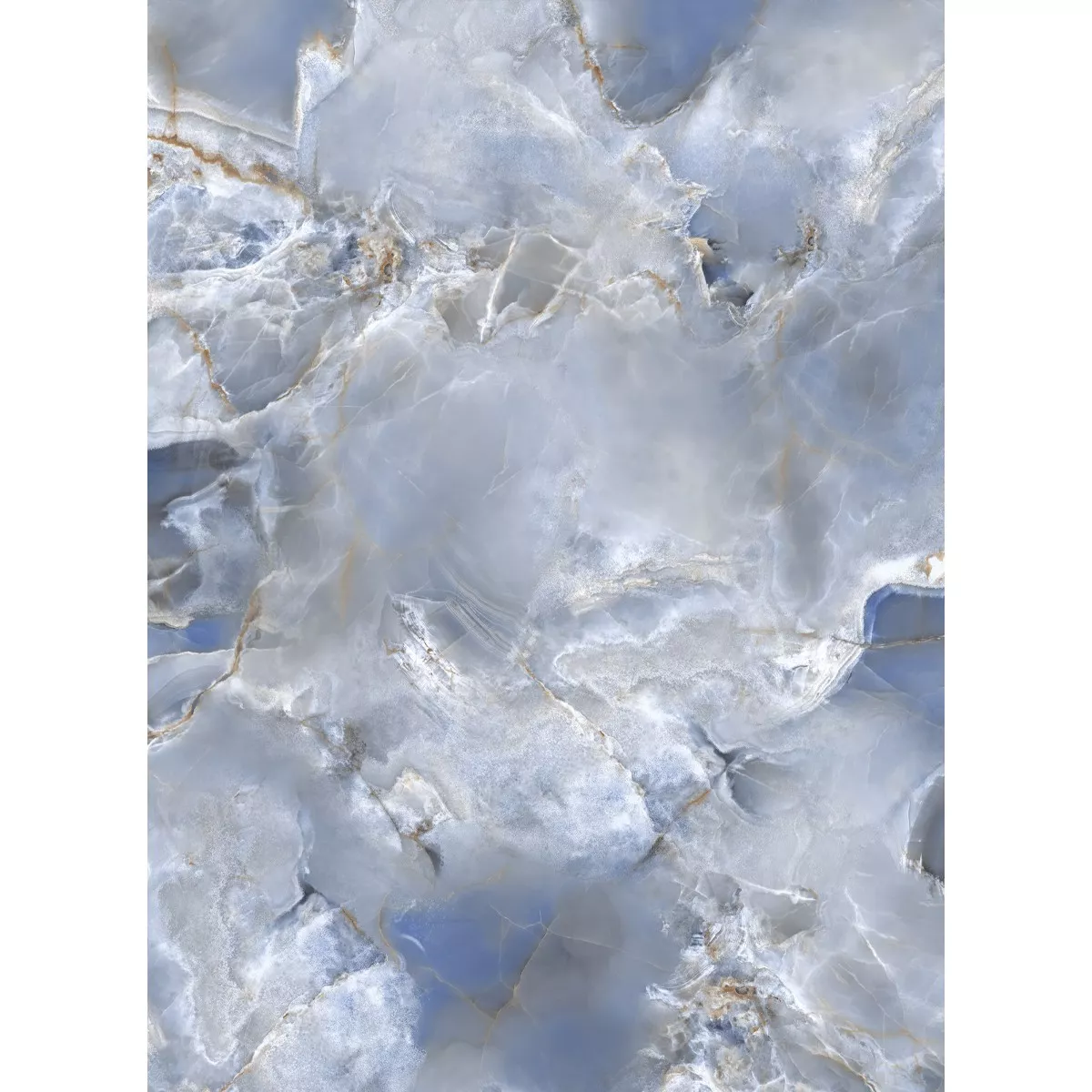 La couleur bleue éclatante et la surface polie, qui accentuent l'aspect marbré, créent un effet saisissant. Les carreaux, d'une longueur impressionnante de 120 cm, ajoutent profondeur et élégance à la décoration.