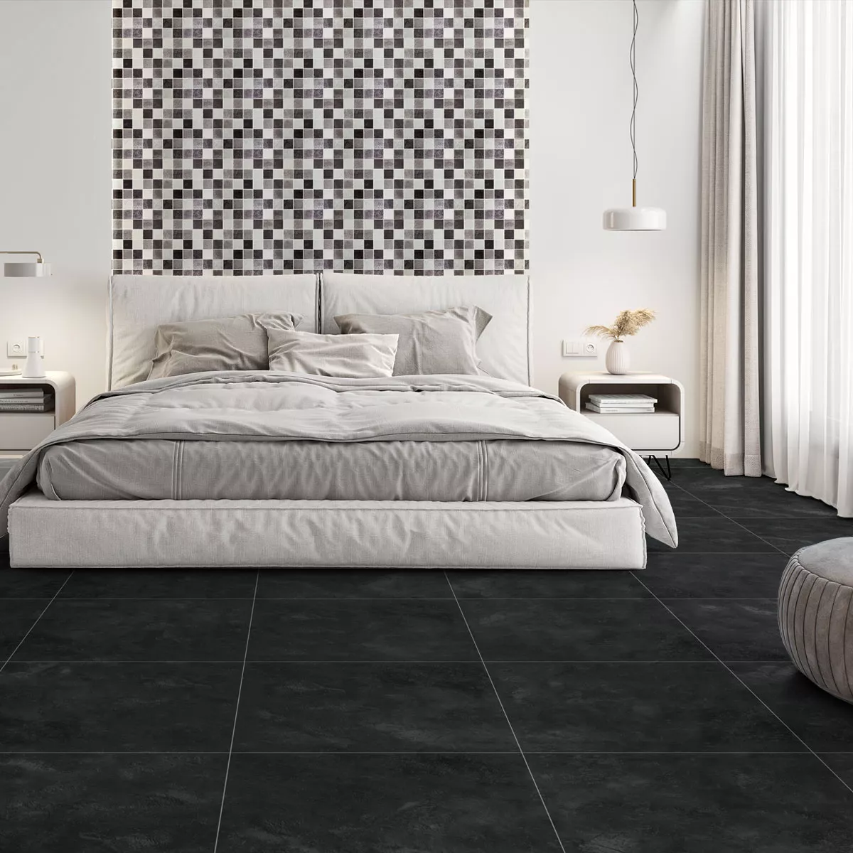 Модерната елегантност се среща с индустриалния чар с нашите подови плочки Cortina в бетонна визия. Тези квадратни плочки в тъмно сиво придават на всяка стая вечна и стилна атмосфера.