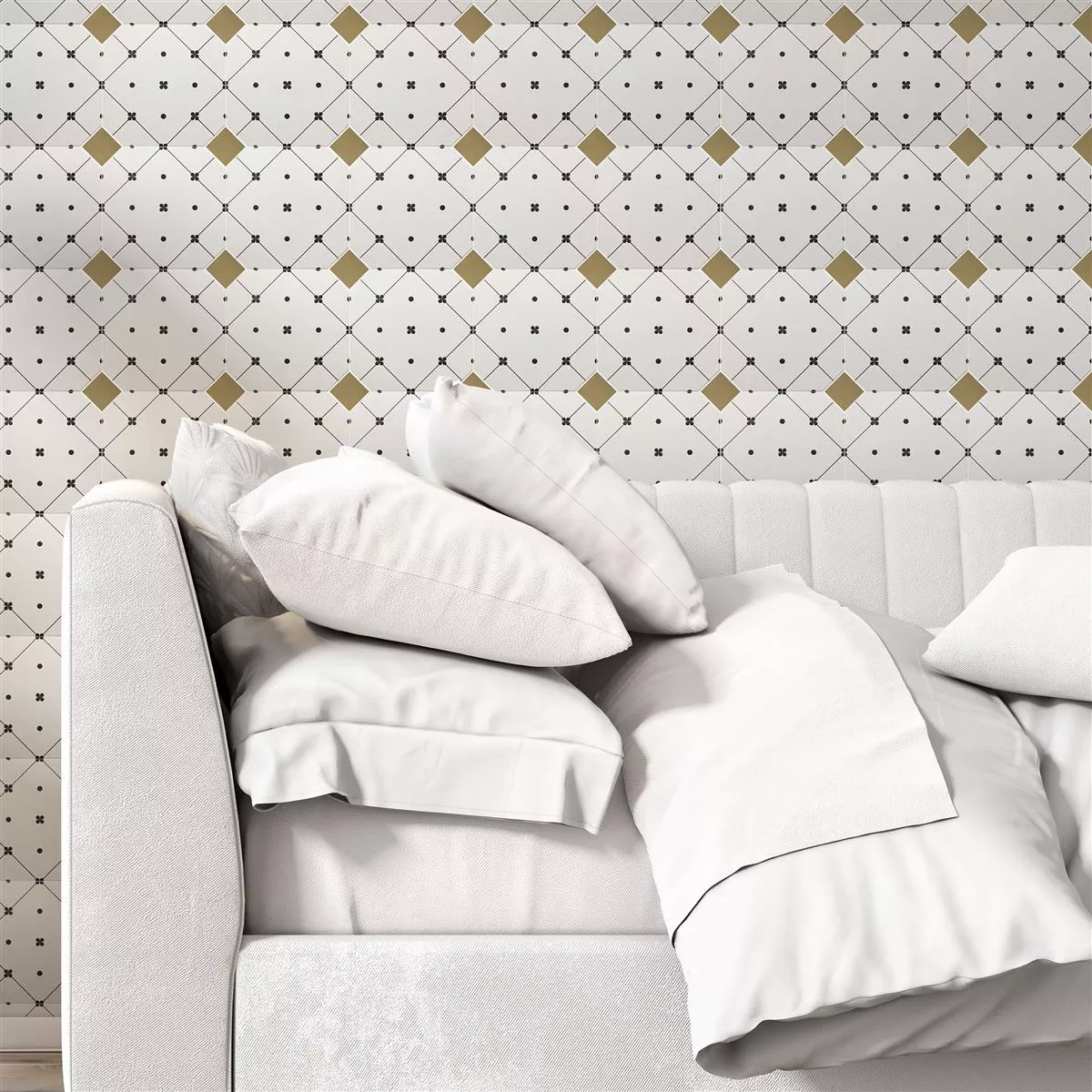 Един пакет включва щедри плочки от 1m² в атрактивен черно-бял декор. С устойчивост на приплъзване R11/C, те са особено подходящи за мокри помещения като бани, кухни и душове.