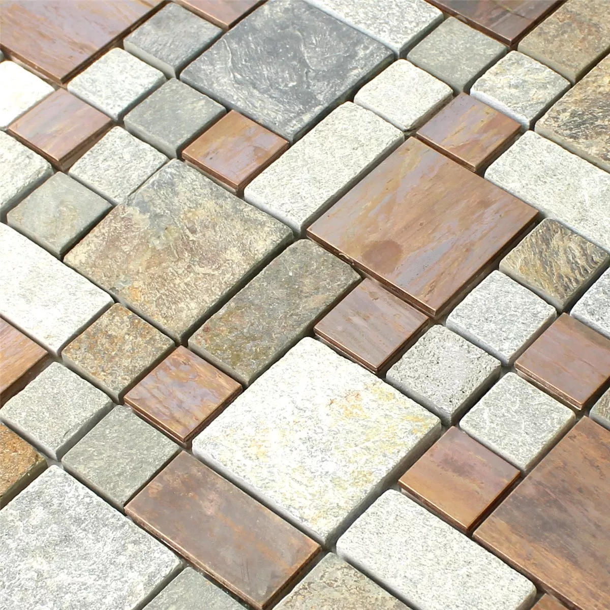 La mosaïque Istanbul associe des tons chauds de beige, de marron, de gris et de cuivre avec une touche de rouille, créant une atmosphère sophistiquée mais rustique. Le mélange de pierre naturelle, de métal et de cuivre donne au carrelage un aspect particulier et une sensation intéressante.