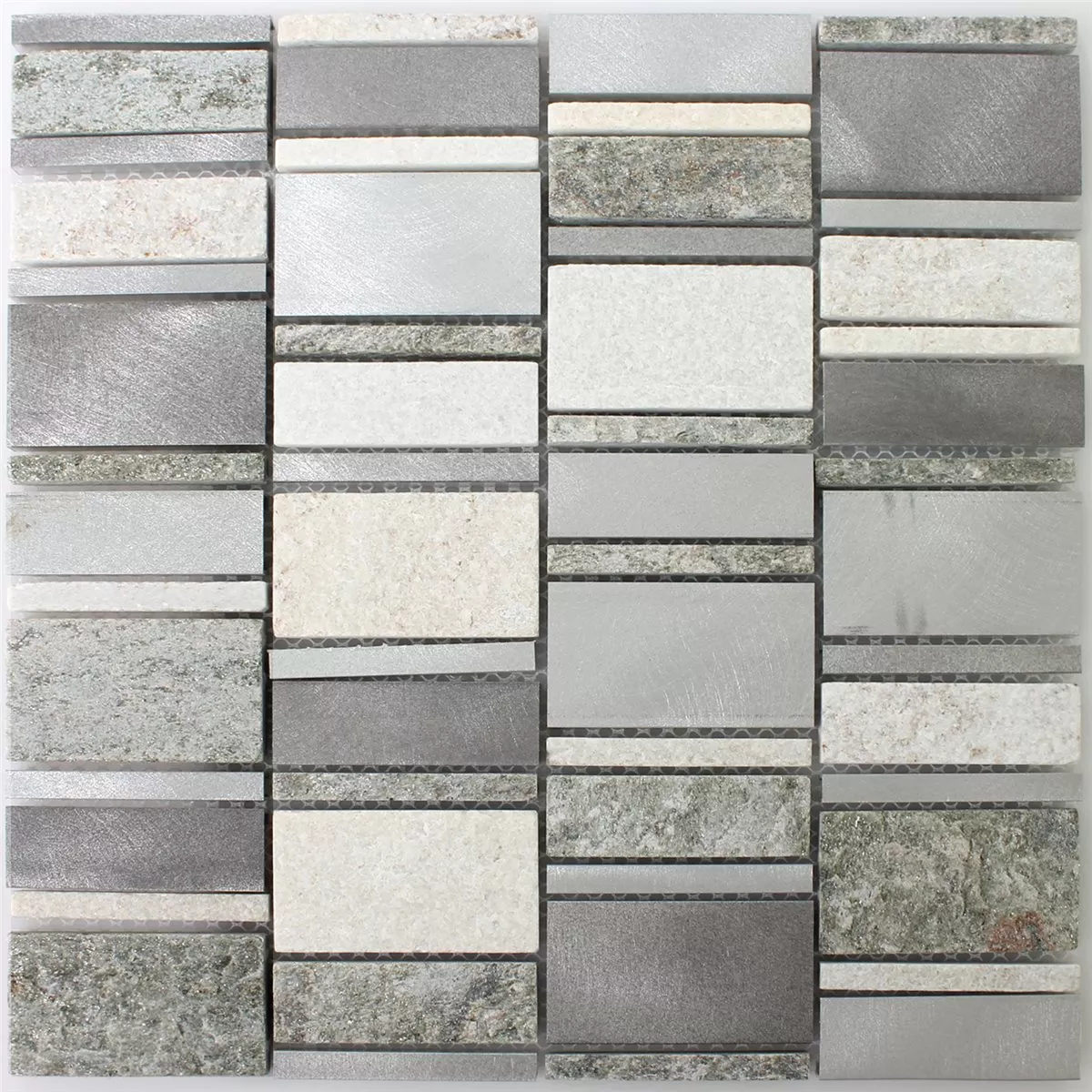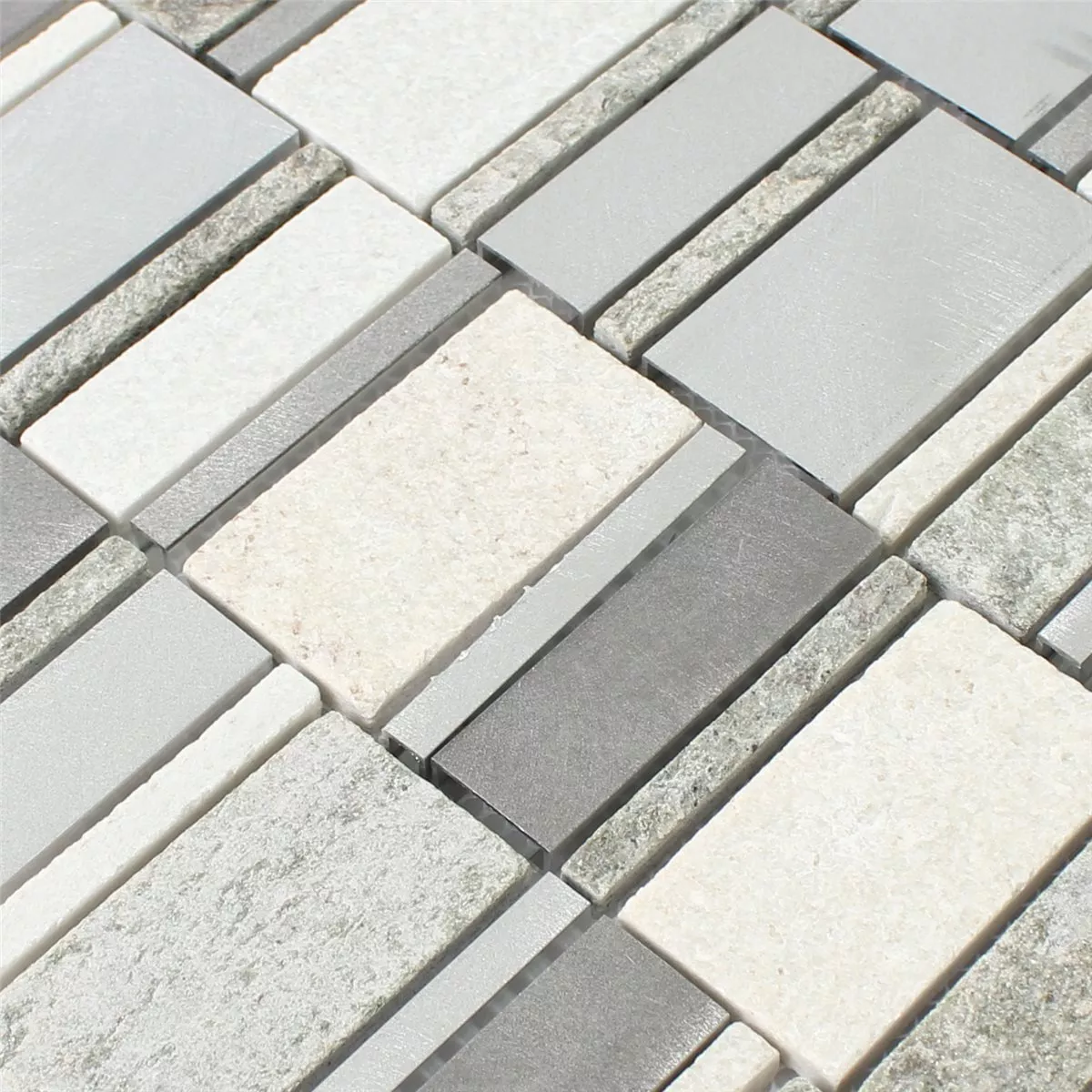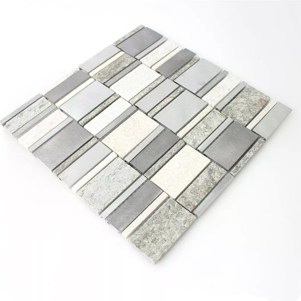 Le carreau de mosaïque Various allie une élégance raffinée à une finition de haute qualité et offre une solution moderne pour la conception des murs dans divers espaces de vie. La combinaison subtile de couleurs gris, argent et beige clair crée un look harmonieux qui s'intègre sans effort dans différents styles de décoration intérieure. Fabriqué à partir d'un mélange de matériaux de haute qualité composé de pierre naturelle, de métal, d'aluminium et de quartzite , le carrelage impressionne par sa surface élégante, mate et brossée, qui crée un effet de profondeur particulier.