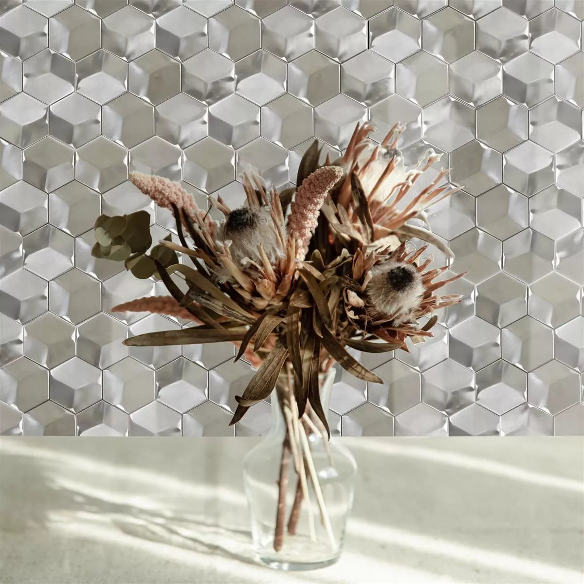 Le moderne tessere di mosaico modello Contender Hexagon nel colore argento opaco sono una buona scelta per tutti gli ambienti arredati in modo stravagante. Le piastrelle per pareti esteticamente accattivanti sono realizzate in acciaio inossidabile spazzolato di alta qualità, in modo che impressionino per il loro aspetto unico per molti anni. I robusti rivestimenti sono progettati come un mosaico 3D. Pertanto, quando la luce cade, ci sono molti bei effetti, non solo per la superficie lucida. L'ottica 3D garantisce inoltre speciali riflessi di luce, che rompono la luce del giorno e qualsiasi luce artificiale in modo particolarmente affascinante nell'ambiente.