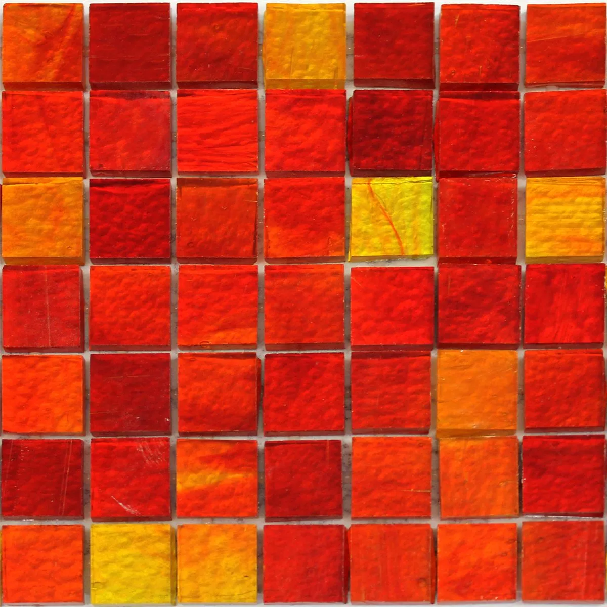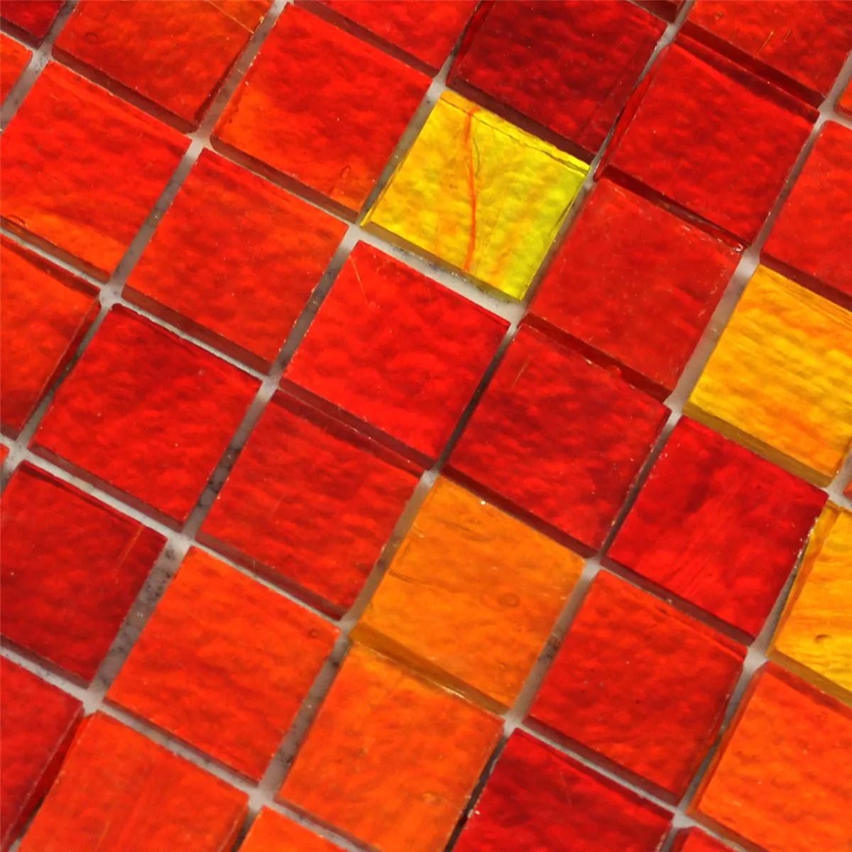 Il mosaico di vetro è anche facile da curare al 100%, quindi queste giocose tessere di mosaico possono essere lasciate pulite e ordinate in pochissimo tempo. Grazie ai numerosi colori diversi offerti dal produttore di mosaici in vetro Trend-Vi nella serie di piastrelle Karma, il mosaico in vetro può essere utilizzato anche come elemento di design. La combinazione di diversi colori delle piastrelle pregiate sembra particolarmente sofisticata. Le tessere di mosaico rosse e gialle si combinano con il mosaico in vetro composto da pietre rosse e gialle della serie Karma, in modo che un'area rossa sembri fluire dolcemente in un'area gialla.