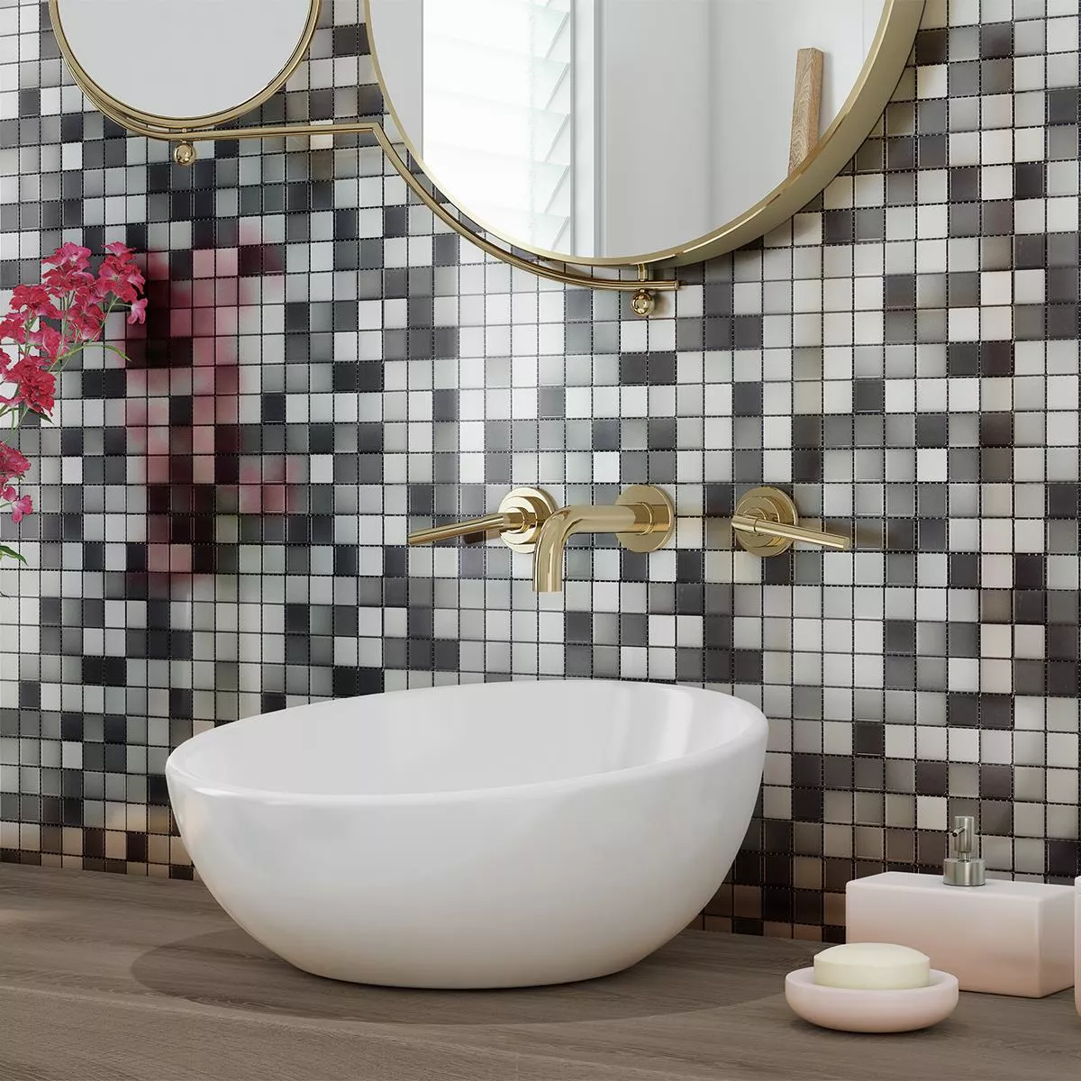 Keramická mozaika Galleria ve stylové černo-šedo-bílé barevné kombinaci přináší moderní nádech do každé místnosti svým moderním kovovým vzhledem a matným povrchem. S velikostí kamene 23 x 23 mm a dlaždicovou rohoží 29,7 x 29,7 cm, která je již nalepena na síť připravenou k instalaci, je instalace na stěny i podlahy obzvláště snadná a přesná.