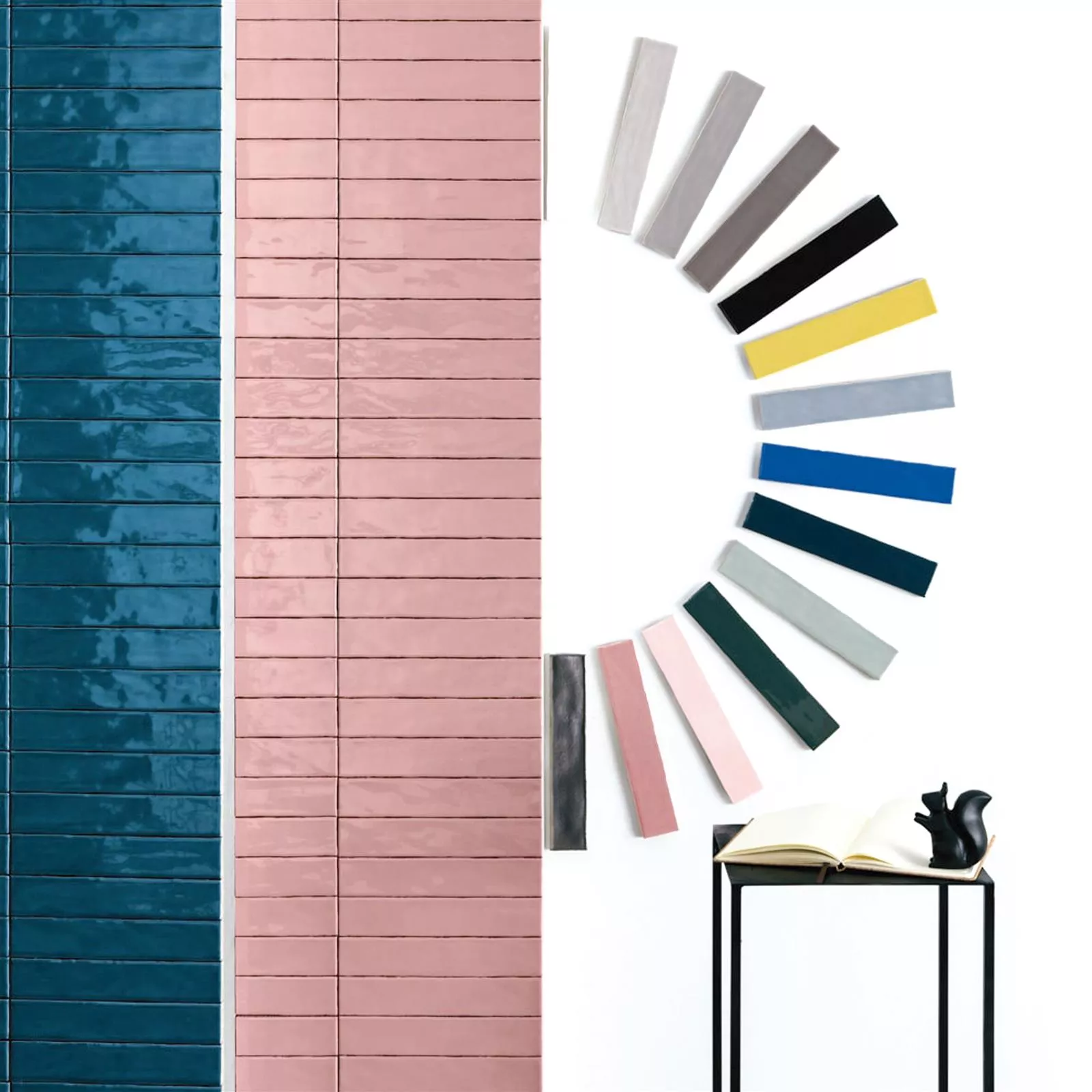 Wall tiles Montreal in different colors, with a wavy, glazed surface made of earthenware. Shiny surface with natural edge.