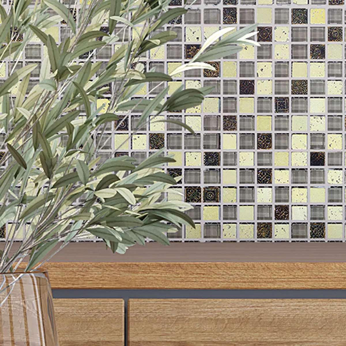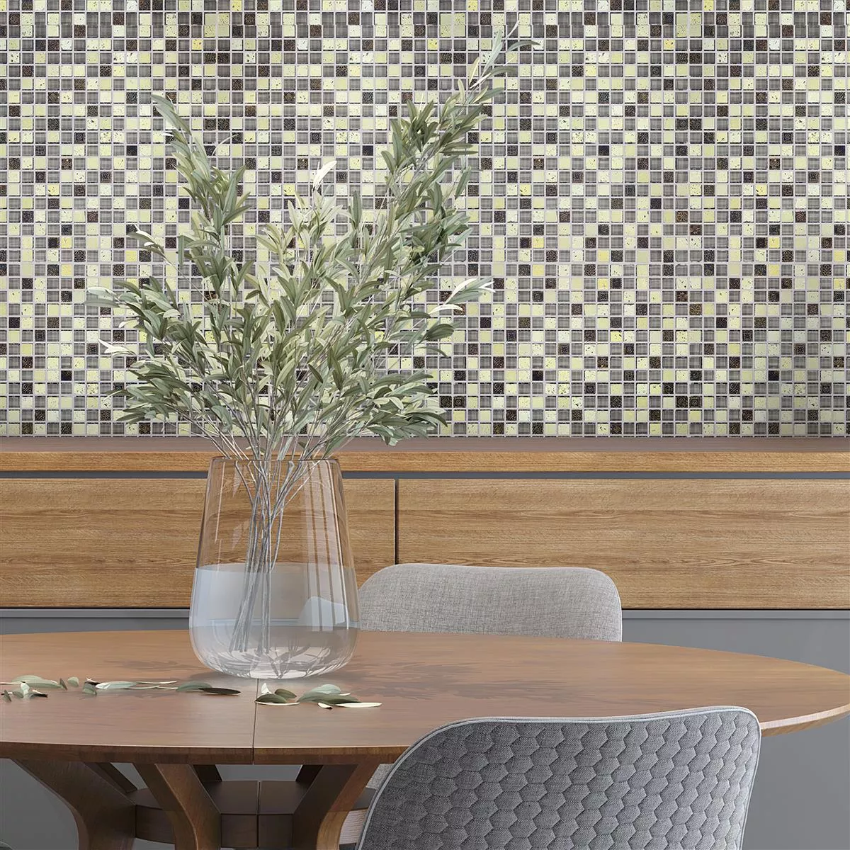 Oplev den tidløse elegance af "Majestic" glasmarmormosaikfliser - en perfekt kombination af sølv og brun, der vil tilføje et strejf af sofistikering til dit værelse. Med en sofistikeret blanding af glas, natursten og marmor tilbyder disse fliser ikke kun æstetisk skønhed, men også imponerende holdbarhed.