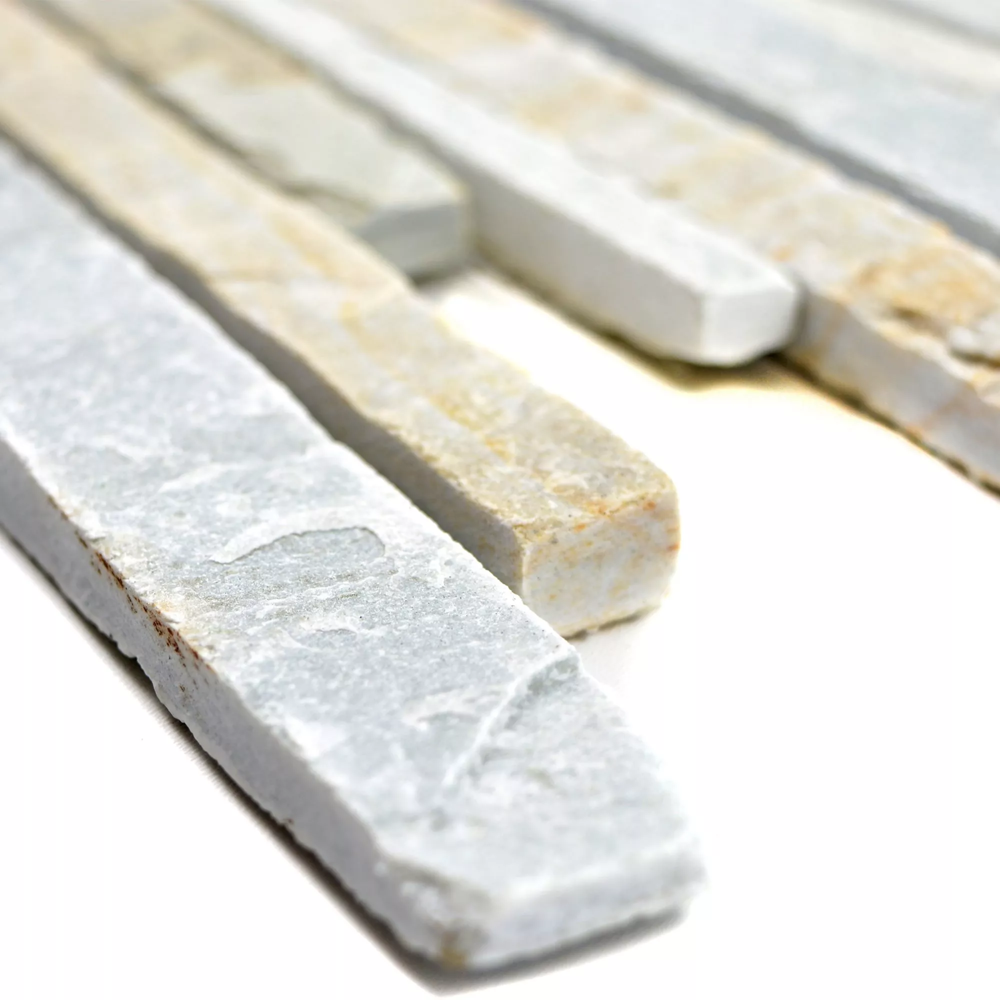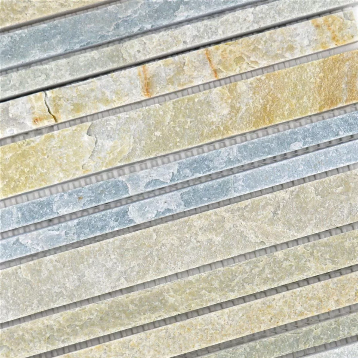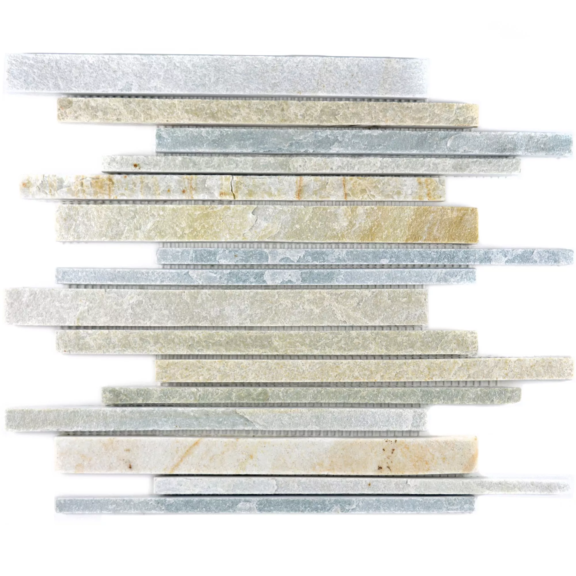 The mosaic tiles quartzite linus stick are a natural product. The raw material quartzite follows no ordinary patterns. What is quartzite? A metamorphic rock with 98 percent quartz content, which makes the tiles robust. A key feature is the resistance to environmental influences, such as sun, heat, cold and heavy rain. These mosaic stones are perfect for outdoor use, where they are exposed to the extreme influences. In addition, the stones beautify the living area in conjunction with a fireplace corner. Ascending heat does not harm the wall cladding. The individual stones with the dimensions 10 x 300, 15 x 300 and 25 x 300 mm are fixed on practical mats. Alternating wide pieces of stone give the unmistakable pattern. The measure of the mat is 30 x 30 centimeters, with a thickness of 10 millimeters.