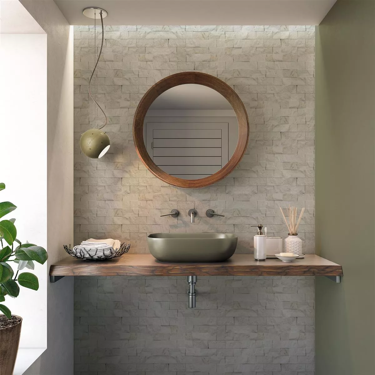 The Mosaic Tiles Natural Stone Kansas Splitface 3D in White are a versatile and attractive option for the design of interiors, especially living rooms and kitchens. Made from natural stone, more specifically Limestone, these tiles will add a rustic and natural charm to your space.