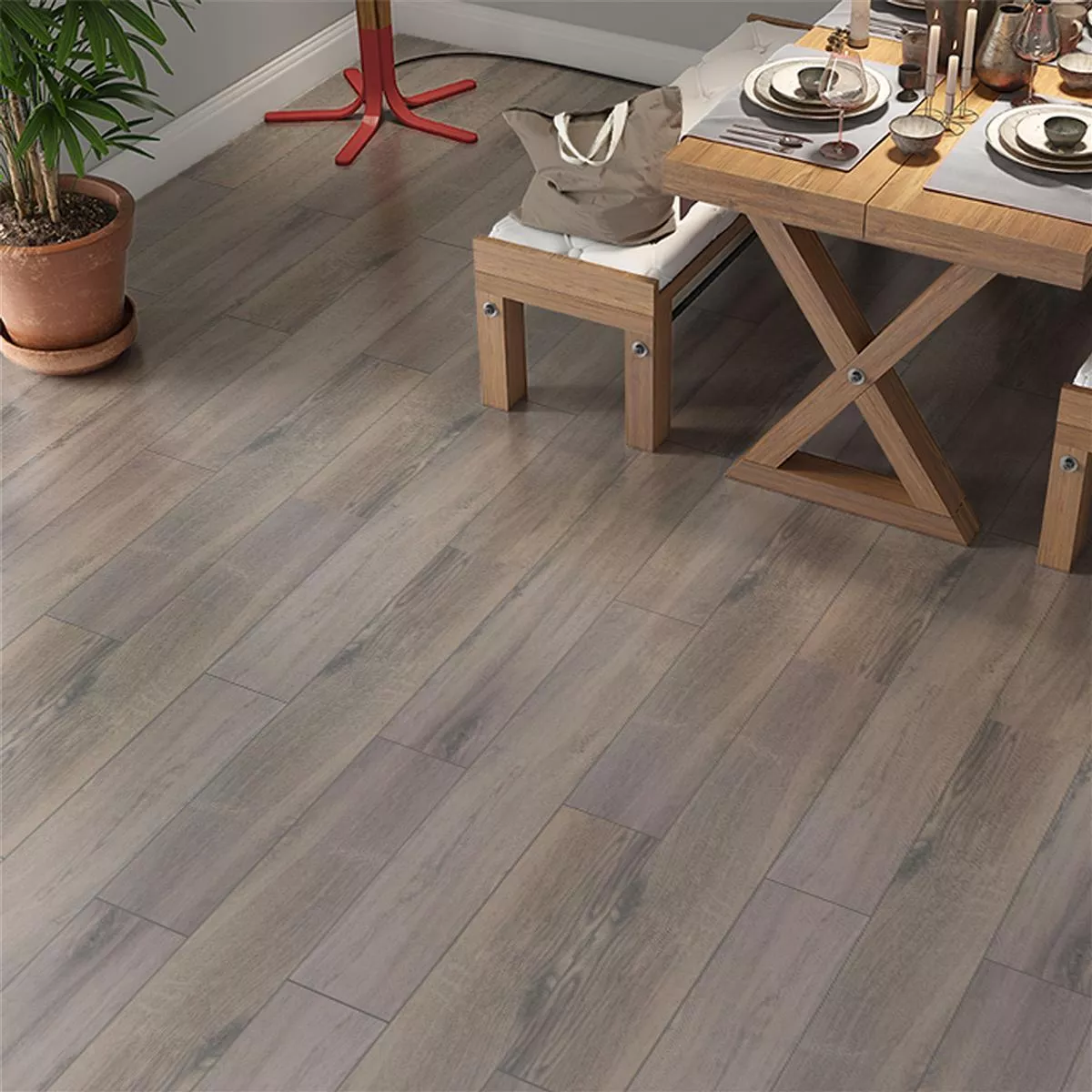 Con un espesor de 9 mm y unas dimensiones de 20x120 cm por loseta, ofrecen un aspecto de madera elegante y moderno que imita las largas tablas de madera. Cada paquete cubre una superficie de 1,44 m², lo que hace que la planificación y colocación de las baldosas sea especialmente eficiente. Las losas están rectificadas, lo que significa que están cortadas con precisión y permiten un ancho de junta estrecho, lo que contribuye a una apariencia elegante y casi sin costuras. Las superficies acristaladas son fáciles de limpiar y ofrecen una alta resistencia al desgaste diario.