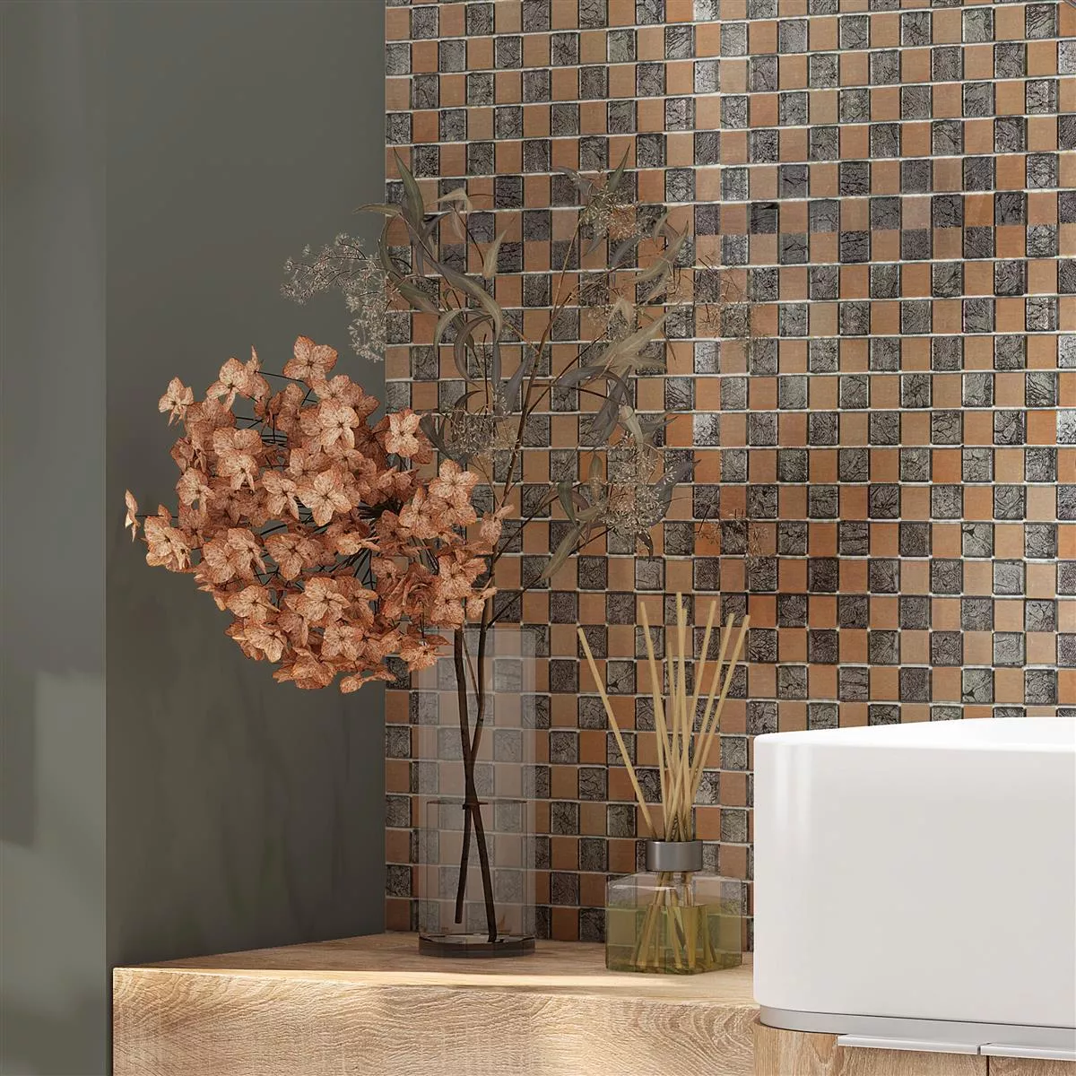 Eldorien kuparinharmaat mosaiikkilaatat lisäävät huoneisiisi hienostuneisuutta ja eleganssia. Harmaan ja kuparin yhdistelmä luo tyylikkään kontrastin, joka asettaa moderneja aksentteja.