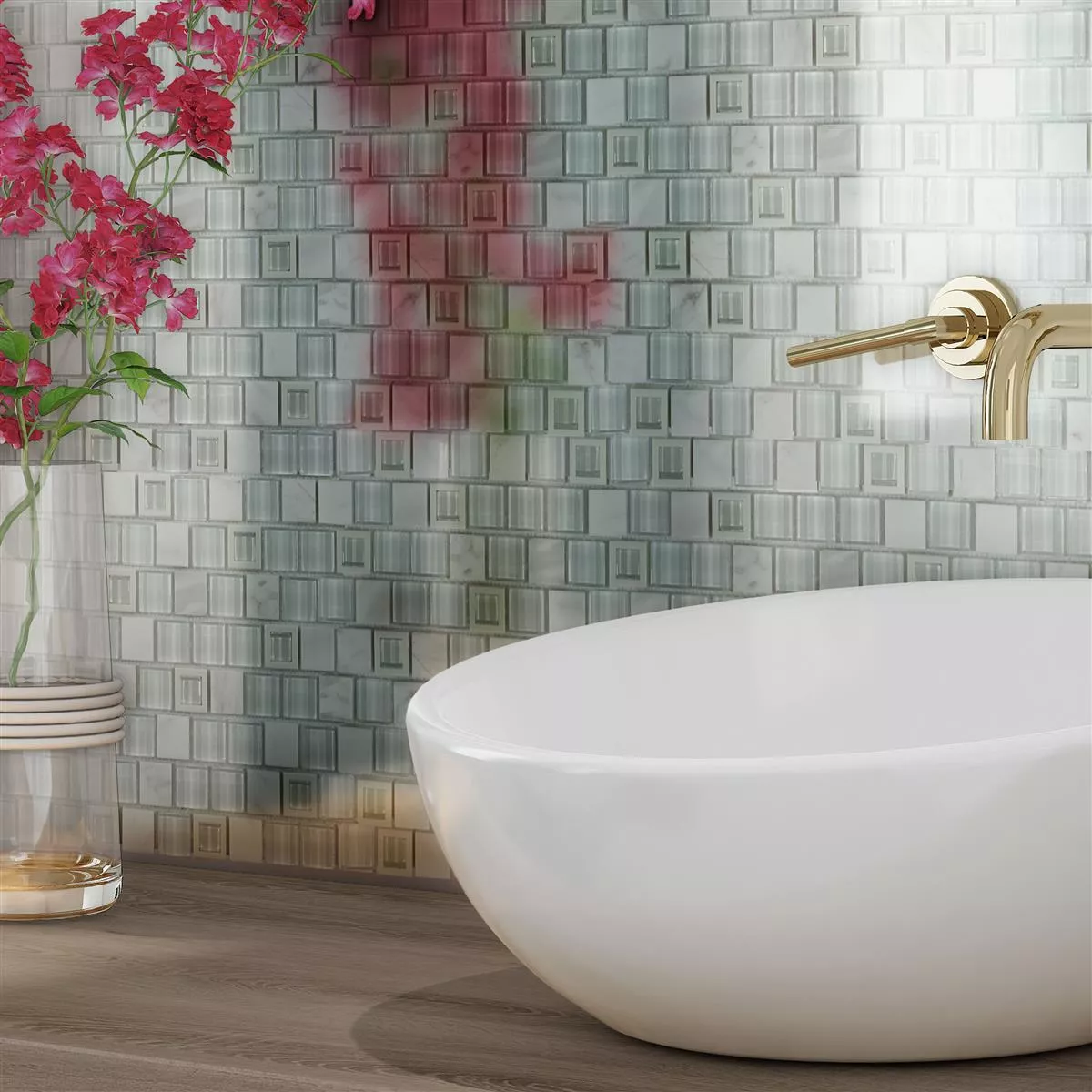 Eri materiaalit - marmori, lasi, muovi ja luonnonkivi - antavat näille laatoille kiehtovan tekstuurin ja kiiltävän pinnan. Kiven koko 23x23mm tuo alueelle mielenkiintoisen ulottuvuuden.