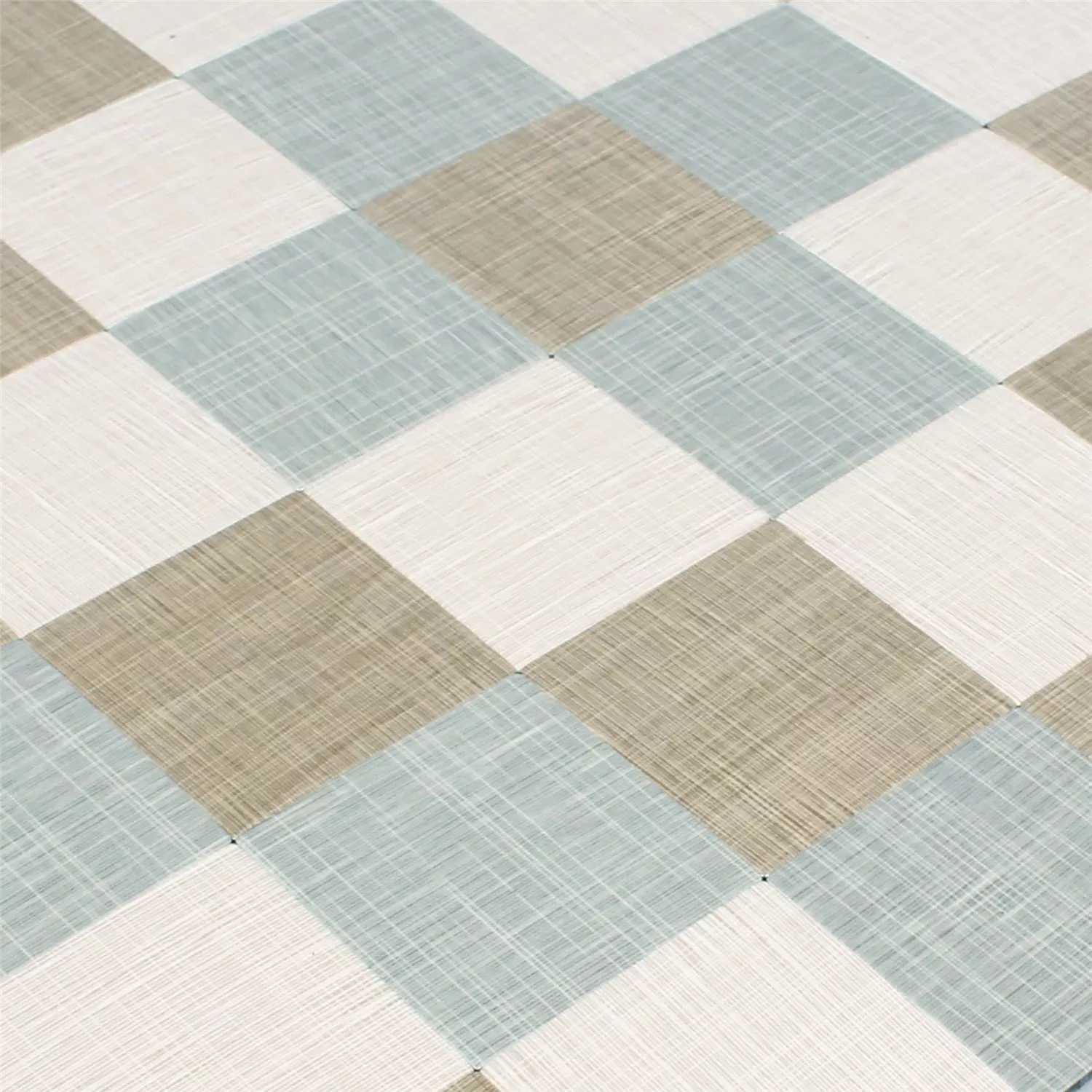 Seinälaatat ruskeana, harmaana ja beigenä tekstiilirakenteella retro- ja vintage-tyylillä. Neliöistä tai suorakulmioiden ja neliöiden yhdistelmästä tehty kuvio. Metalliset mosaiikkilaatat ovat itsekiinnittyviä ja siksi helppo kiinnittää sisätiloihin (kosteat tilat pois lukien).