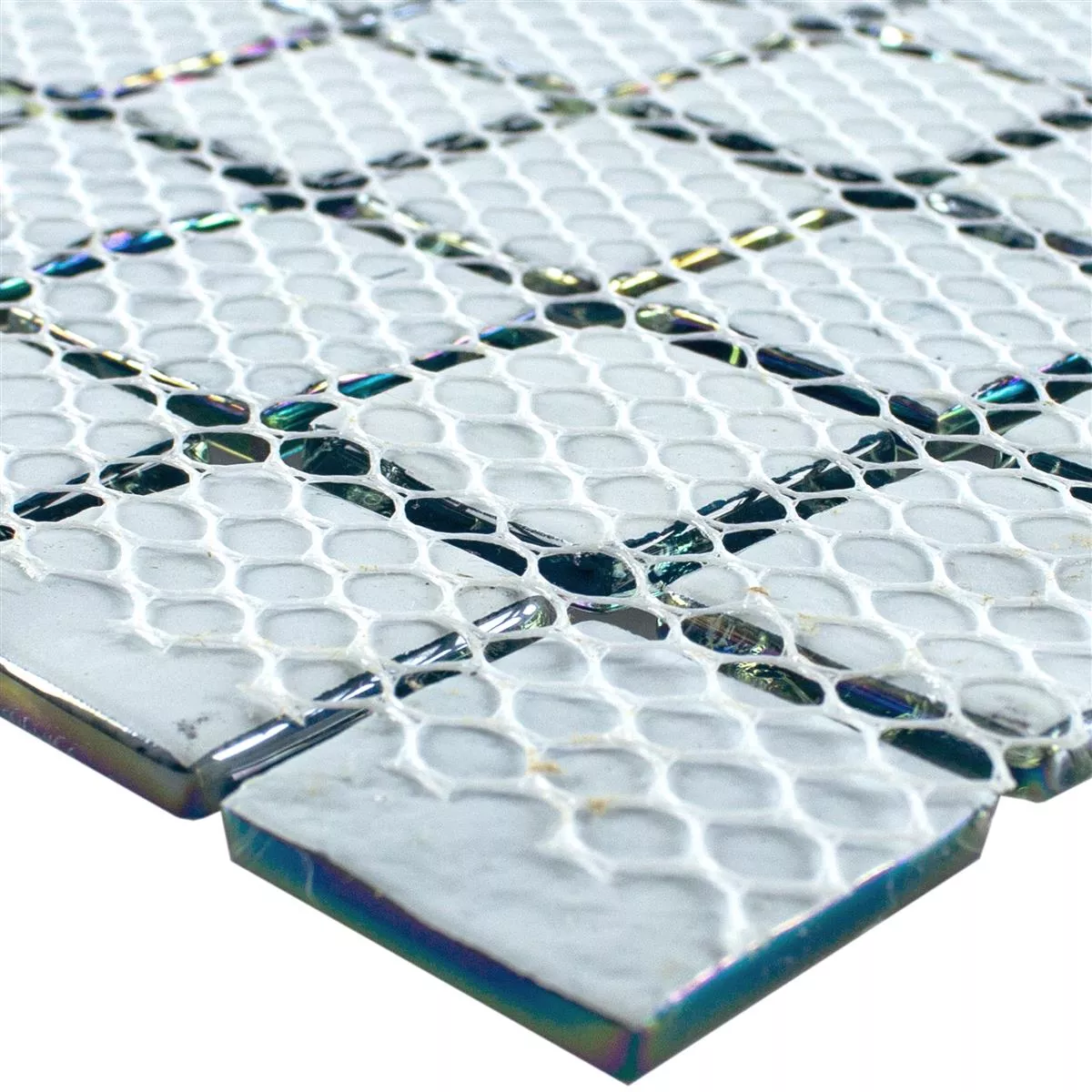 The mother-of-pearl effect gives the tiles a fascinating look, as they show different color nuances and reflections depending on the incidence of light. This helps create a lively and engaging spatial experience.