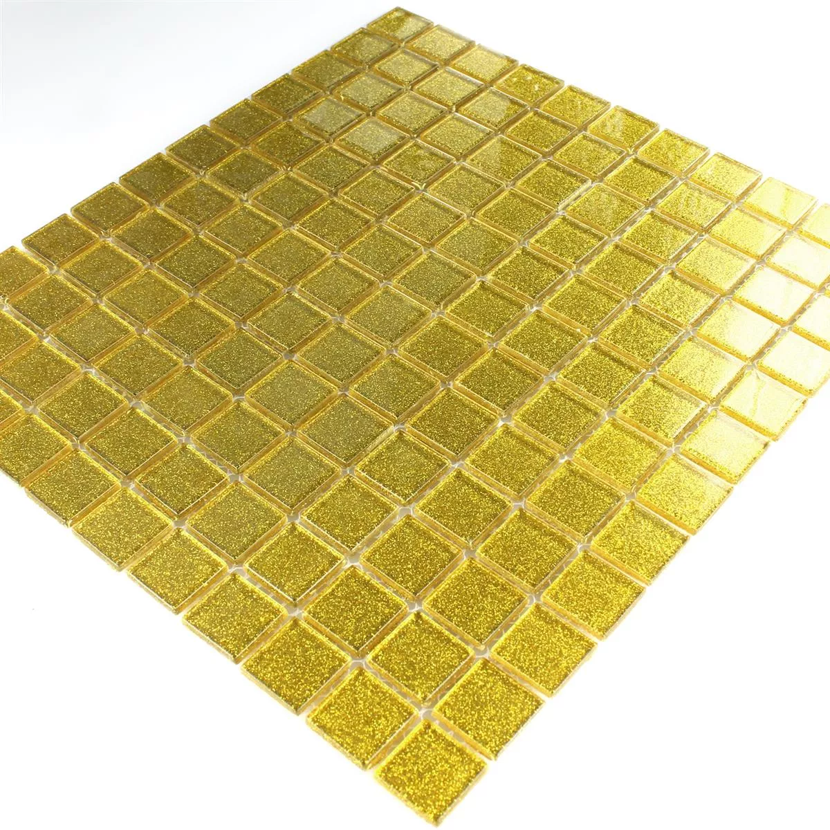The glass mosaic tile Wichita in gold glitter unfolds its decorative effect not only in kitchens and bathrooms. The decorative, glittering surface also gives sleeping and living areas a special ambience. In terms of hygiene, durability and ease of care, wall tiles are superior to all other cladding. Glass mosaic tiles with a glitter surface are a trend in living room design. With them, both subtle designs with a slightly structured surface and strong contrasts with eye-catching colors can be created.