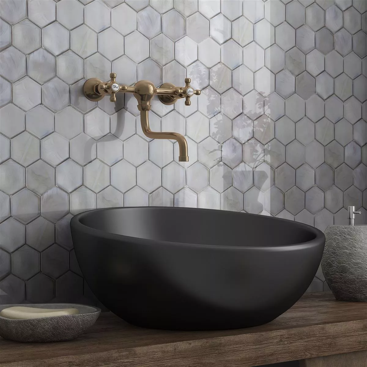 Τα γυάλινα μωσαϊκά πλακάκια Andalucia Hexagon Grey είναι μοντέρνα πλακάκια τοίχου από γυαλί υψηλής ποιότητας. Σε βαθύ μαύρο, δίνουν ελκυστικό σχεδιασμό σε δωμάτια όπως το μπάνιο, η κουζίνα, το σαλόνι και το ντους. Η γυαλιστερή επιφάνεια με εφέ φίλντισι δίνει στα πλακάκια μια κομψή εμφάνιση.
