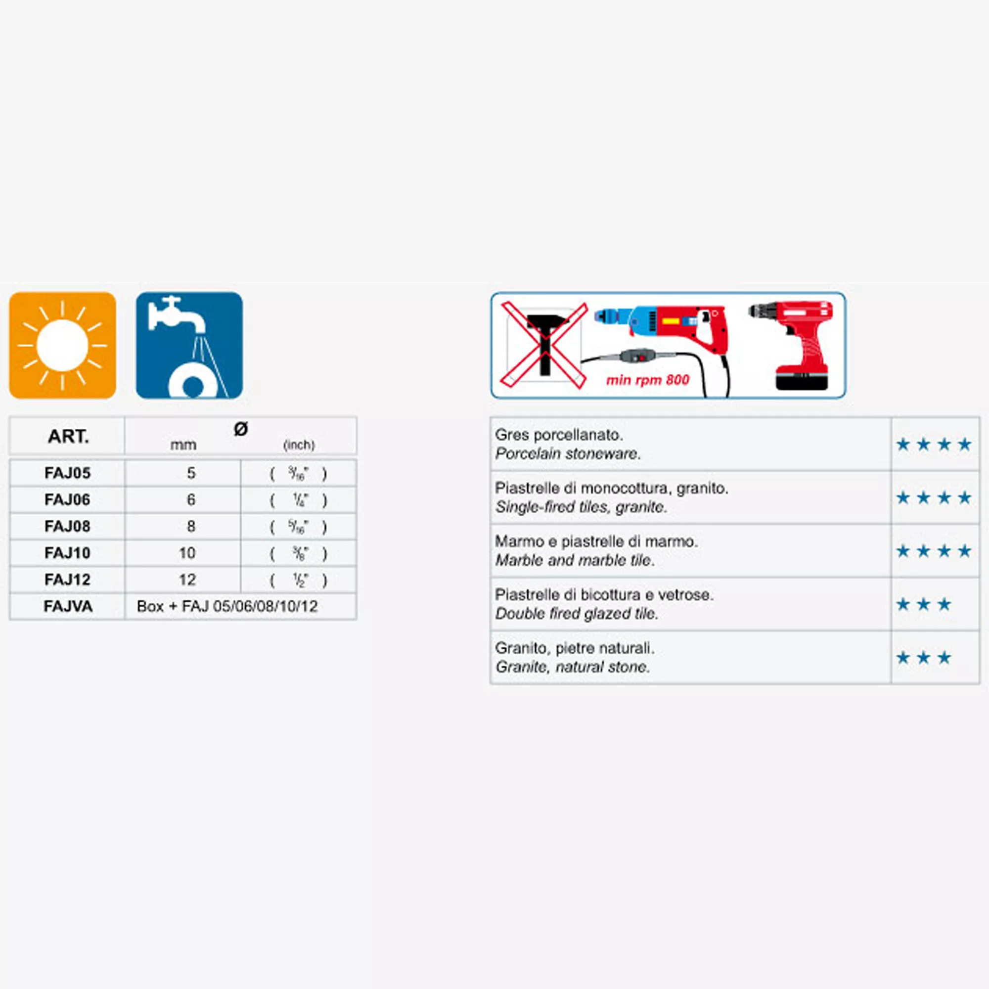 Važno je da bušilica postigne barem 800 okretaja u minuti kako bi se s dijamantnim svrdlom mogao postići dobar rezultat. Prije uporabe potrebno je proučiti upute za uporabu i upute za bušilicu i svrdlo kako se tijekom suhog bušenja ne bi pokvarilo. Informacije o upotrebi, dostupnosti i rokovima isporuke artikla možete dobiti u korisničkoj službi. Cijene navedene u online trgovini su jedinične cijene. Služba za korisnike dostupna je putem telefonske linije za korisnike i rado će vam pomoći ako imate bilo kakvih pitanja.