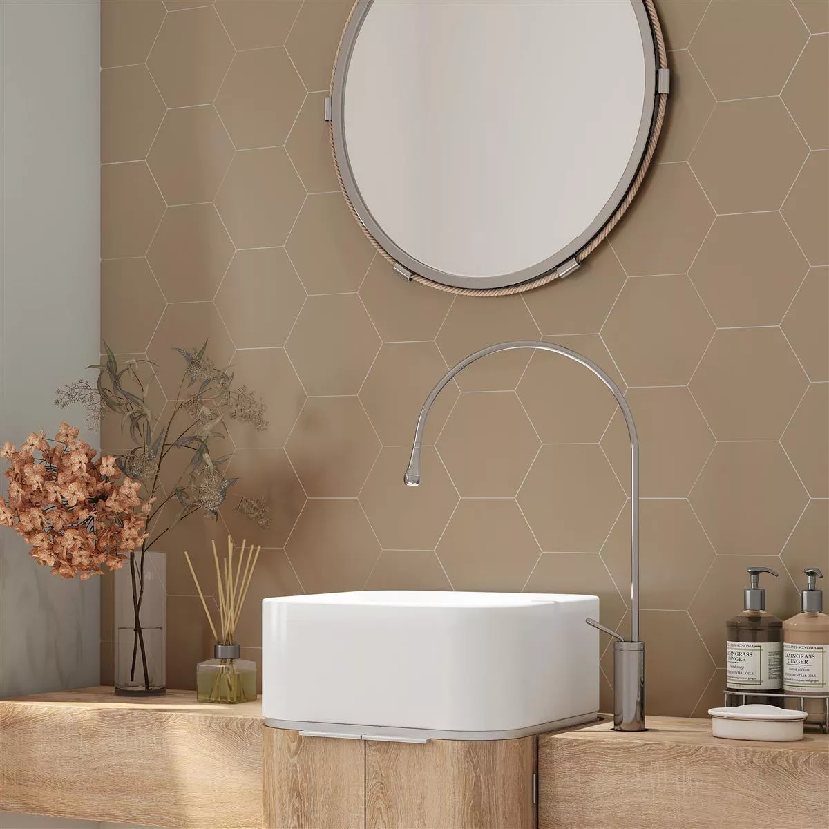 Le piastrelle in gres porcellanato “Modena Hexagon Uni Sand” uniscono estetica e funzionalità in uno. Con un sorprendente design esagonale, creano un'atmosfera unica nella tua zona umida, doccia, bagno, cucina, soggiorno e area interna. Con uno spessore di 10 mm, offrono una base solida, mentre la resistenza allo scivolamento R10 garantisce sicurezza.