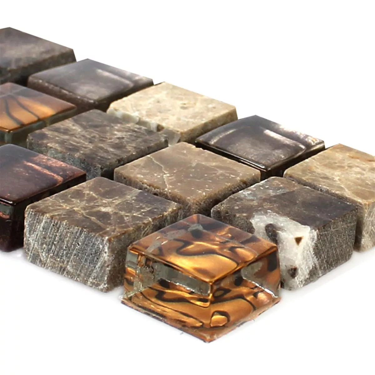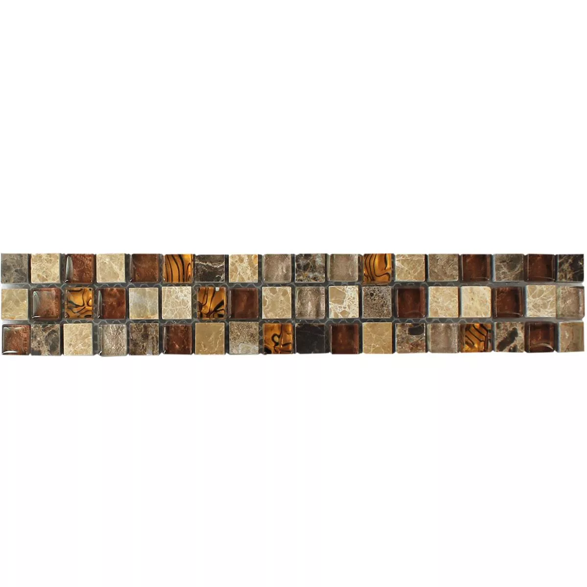 The natural stone mosaic border Gabon brown is an attractive option for designing interiors, especially for bathrooms, kitchens and living rooms. The border is kept in a warm brown tone and consists of a combination of natural stone, glass and marble. The stone size is 15x15mm and the surface is glossy, which gives the mosaic an elegant and attractive look.