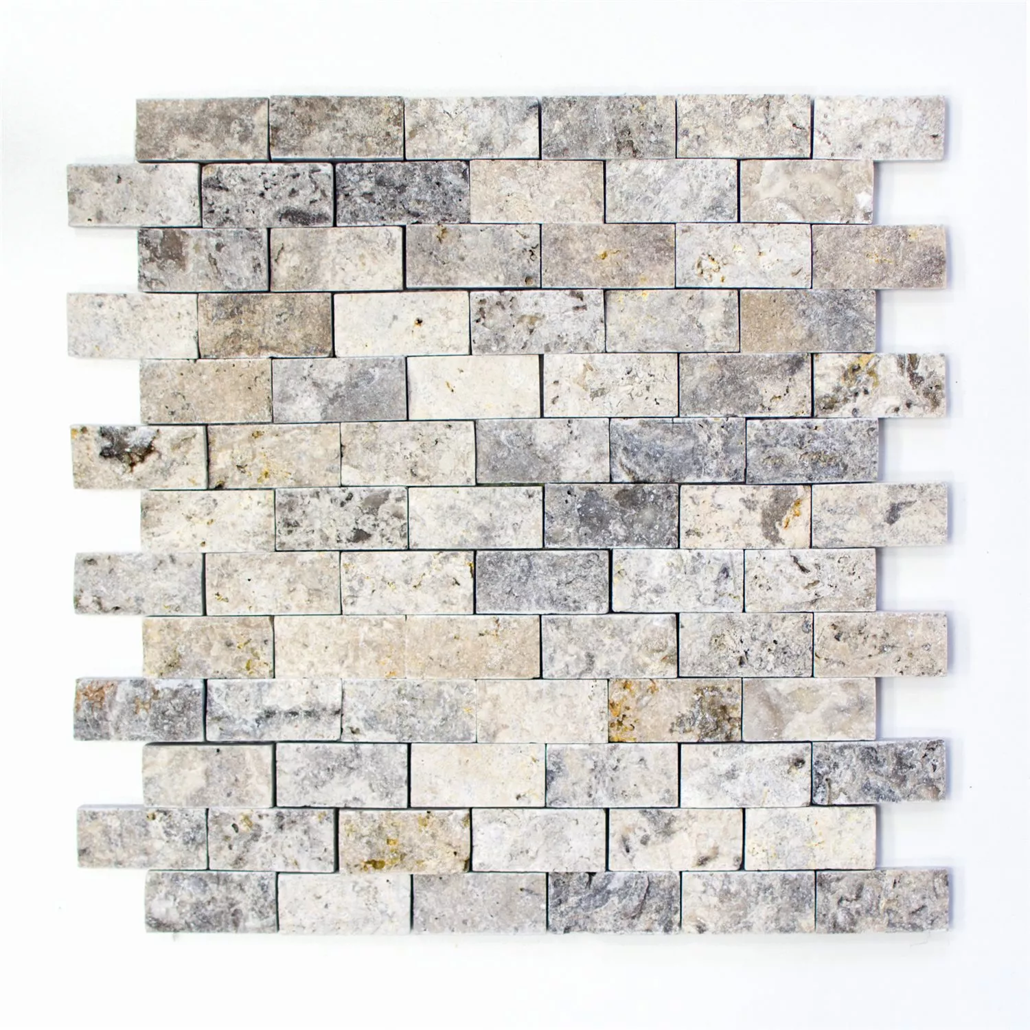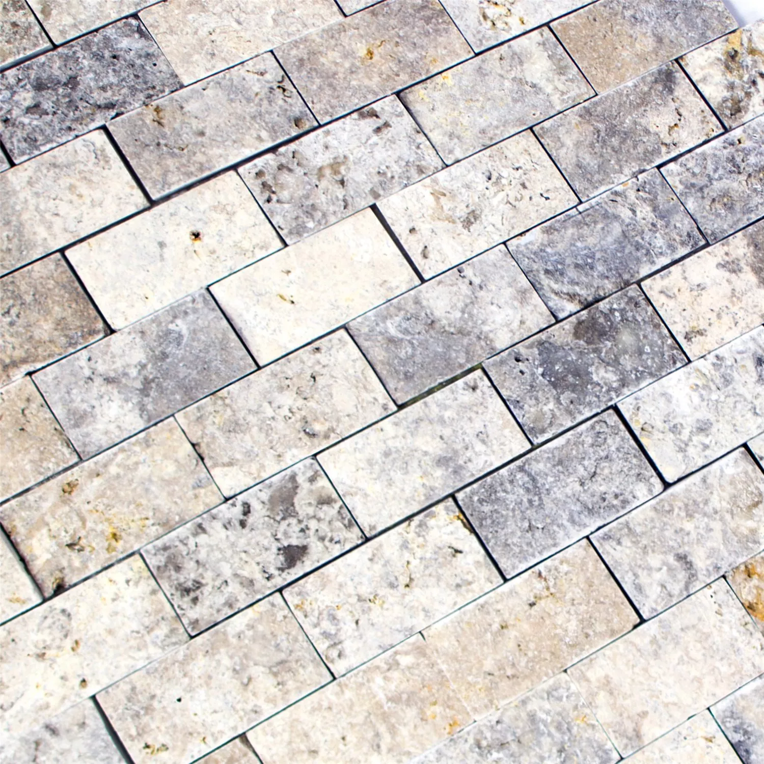 These mosaic tiles Nestor Silver 3D made of the robust natural material travertine are cut directly out of the stone. The stone looks slightly silver shimmering. They are excellent for all outdoor areas. The material is slightly structured. This ensures that water on the stones can run off quickly, making the surface hard to walk on quickly. Even in frost, the stone does not become smooth with slight moisture but can still be used.