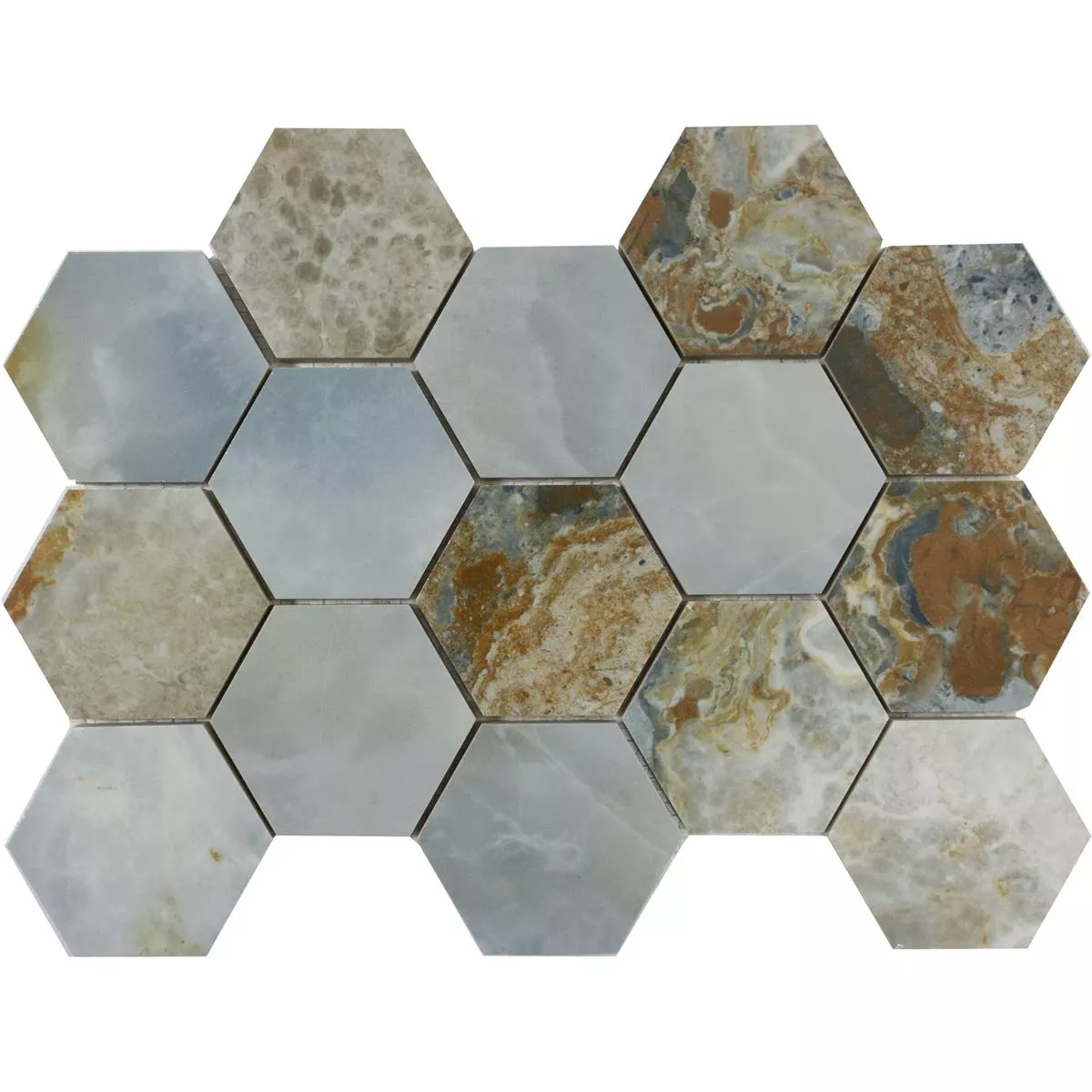 Thanks to the rectified edges, the tiles have a precise geometry that enables precise installation. With a thickness of 10.7mm and a stone size of 88x71mm, they give walls and floors a solid structure. The hexagon format, a modern variant of geometric shapes, fits seamlessly into contemporary interior designs.