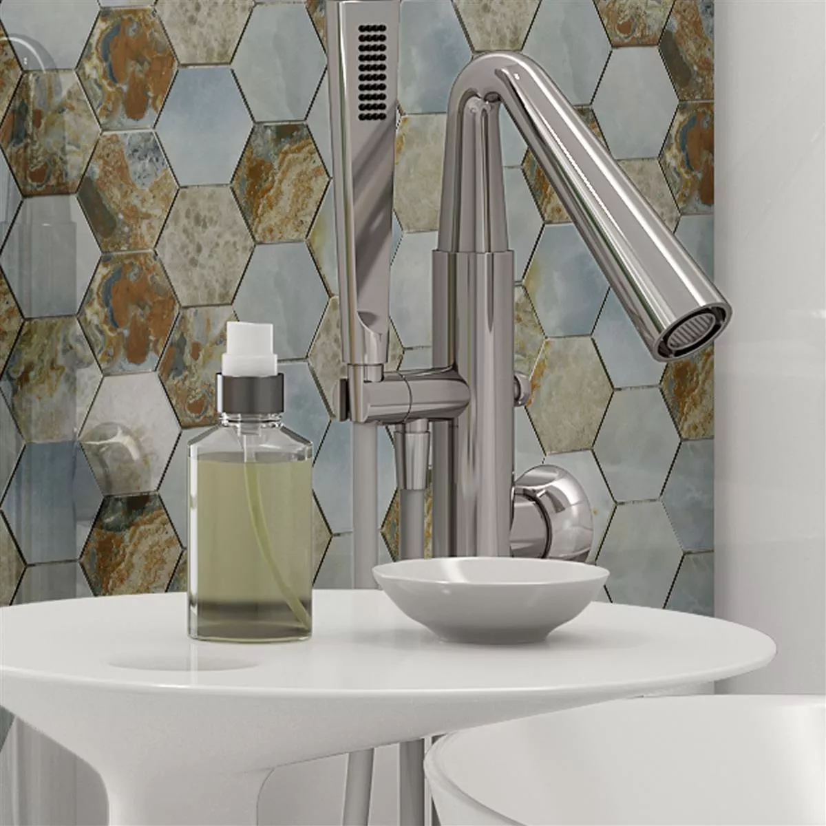 The ceramic mosaic tiles Naftalin Hexagon in the warm shades of brown and blue combine timeless elegance with modern design. Made from high-quality polished porcelain stoneware, they not only impress with their aesthetic appeal, but also with their robustness and longevity.