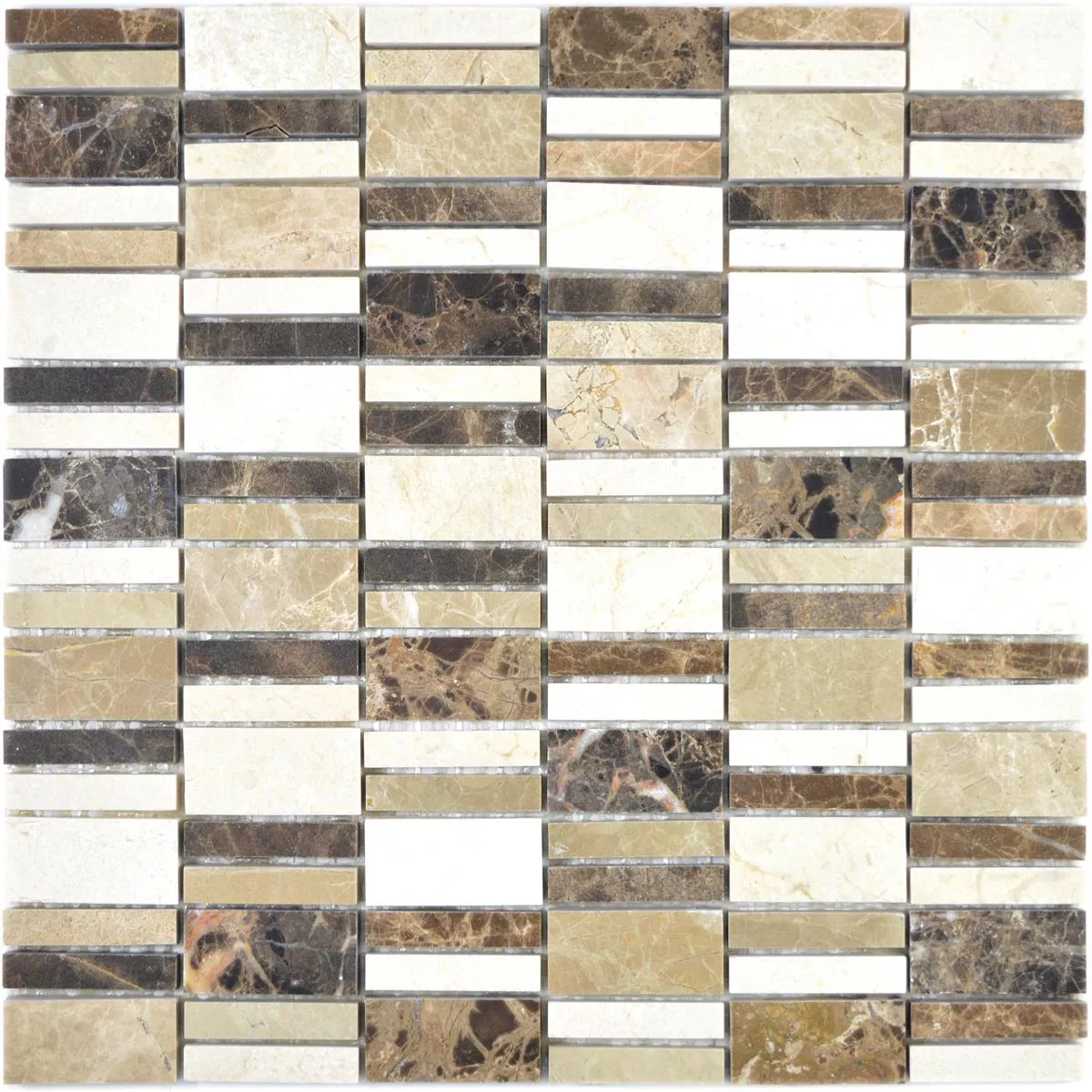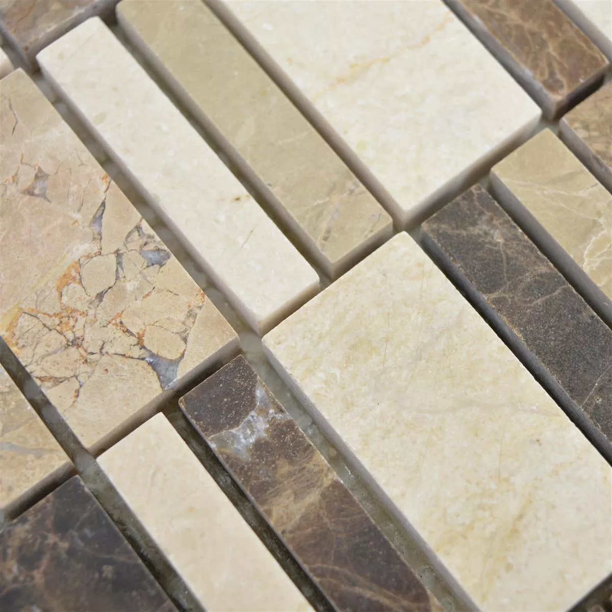 Marble Mosaic Tiles Sunbury is made of precious marble. It is in the colors brown beige with a shiny surface with the stone sizes 23 x 48 mm, 15 x 48 mm and 10 x 48 mm.