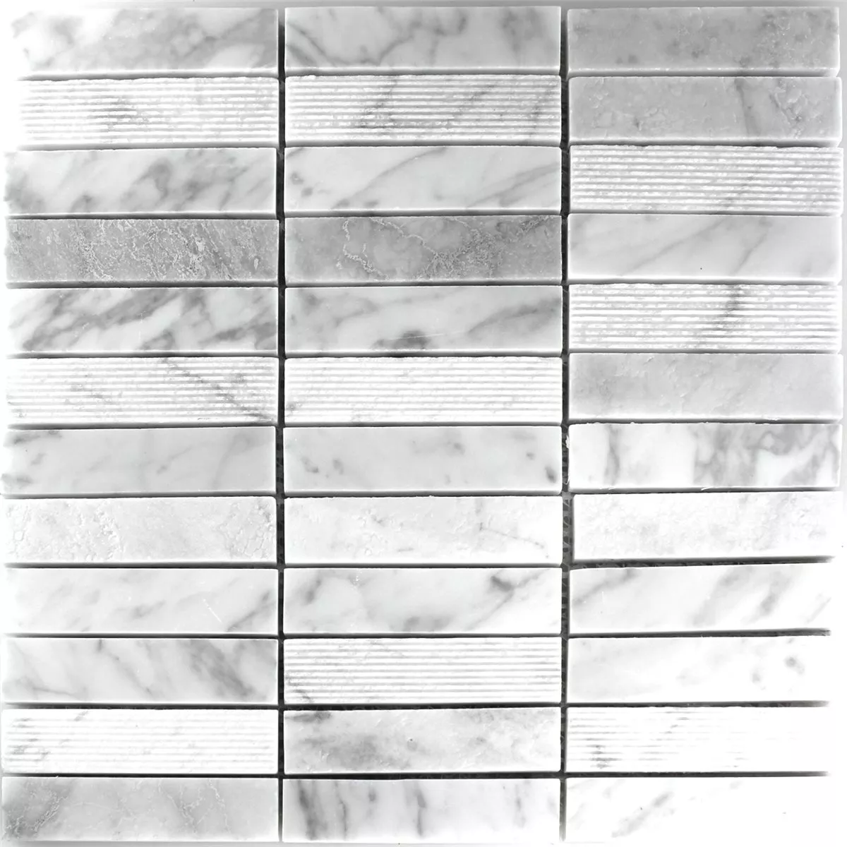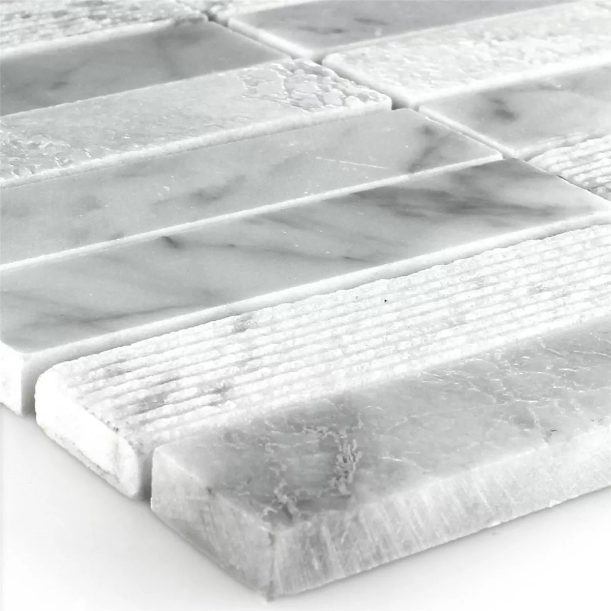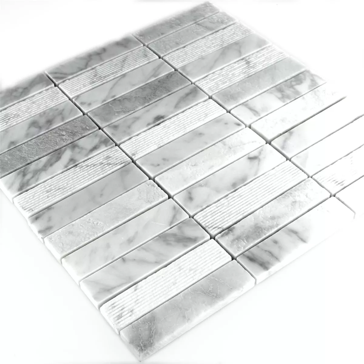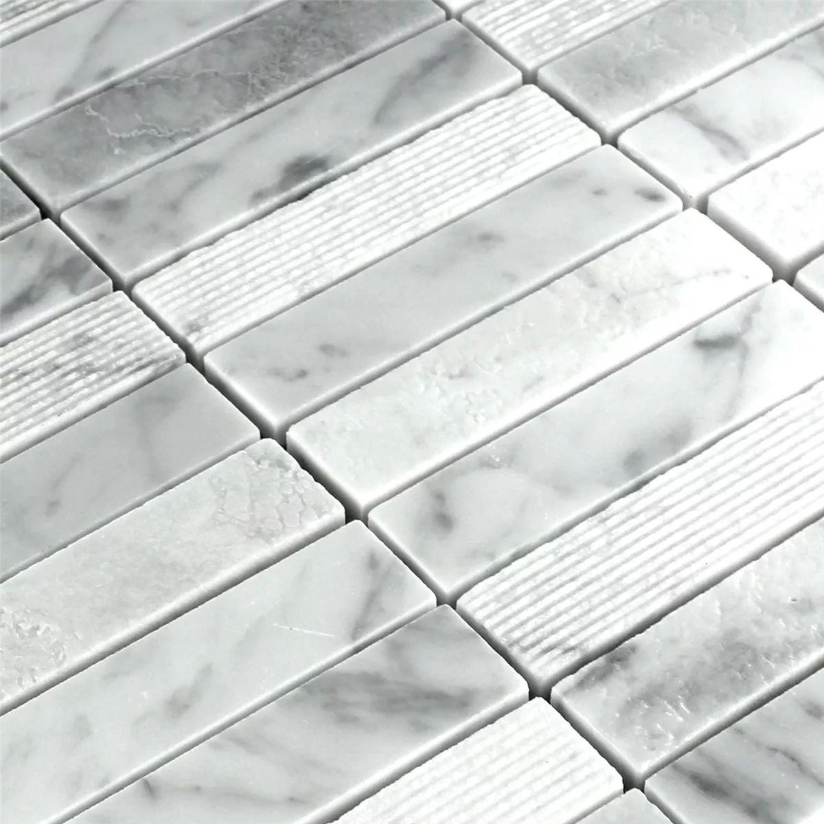 Ich habe eine Matte dieses Mosaiks bestellt, in der Höhe halbiert und die beiden Teile nebeneinander über dem Waschbecken des Badezimmers angeklebt. Die grau-weiße Farbgebung und die abwechselnde Oberflächengestaltung - poliert, gefräst, getrommelt - greifen einerseits die Farbe meiner Carrara-Marmor-Fensterbank auf, bilden andererseits einen dezenten Kontrast zu den matt-weißen, großformatigen Fliesen rund um den Waschtisch. Die Marmorstäbchen waren gut auf der Matte fixiert und ansprechend angeordnet. Ich erwäge, mir weitere Matten zu bestellen und diese als Bordüren zu verwenden.