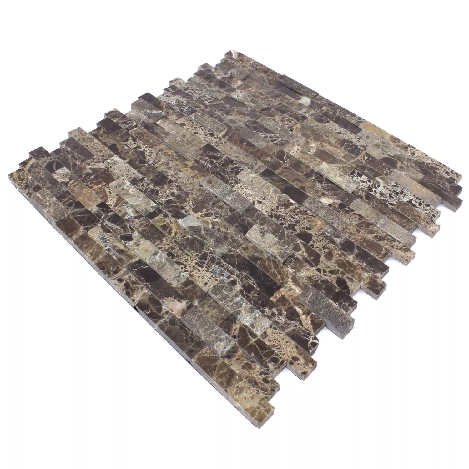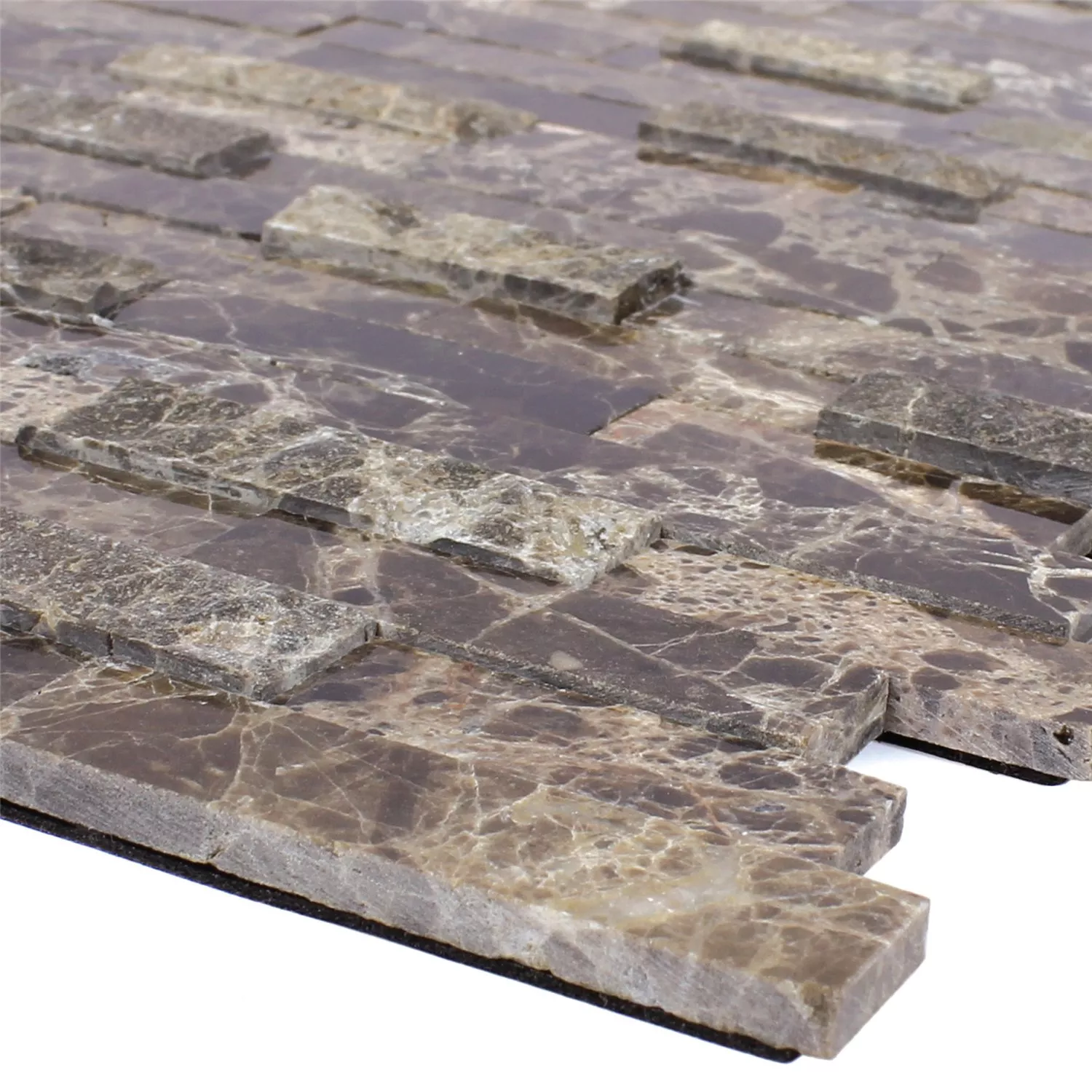 The self-adhesive Coronel Emperador natural stone mosaic tiles offer a high-quality look and are a natural product. These tiles with their rectangular shape give a very natural pattern and these tiles are very easy to work with because they are self-adhesive. The surface is matt and creates a natural shine. The naturalness of this product is achieved through the structure that this tile retains on the surface. Mosaic tiles here are intended for indoor use and these natural stone mosaic tiles are not suitable for wet areas. With the use of natural stone mosaic tiles as wall tiles, you achieve a noble ambience, as these high-quality tiles accentuate your interior even better. The naturalness of the structure and the charisma always look up-to-date and make this product one of our top sellers.