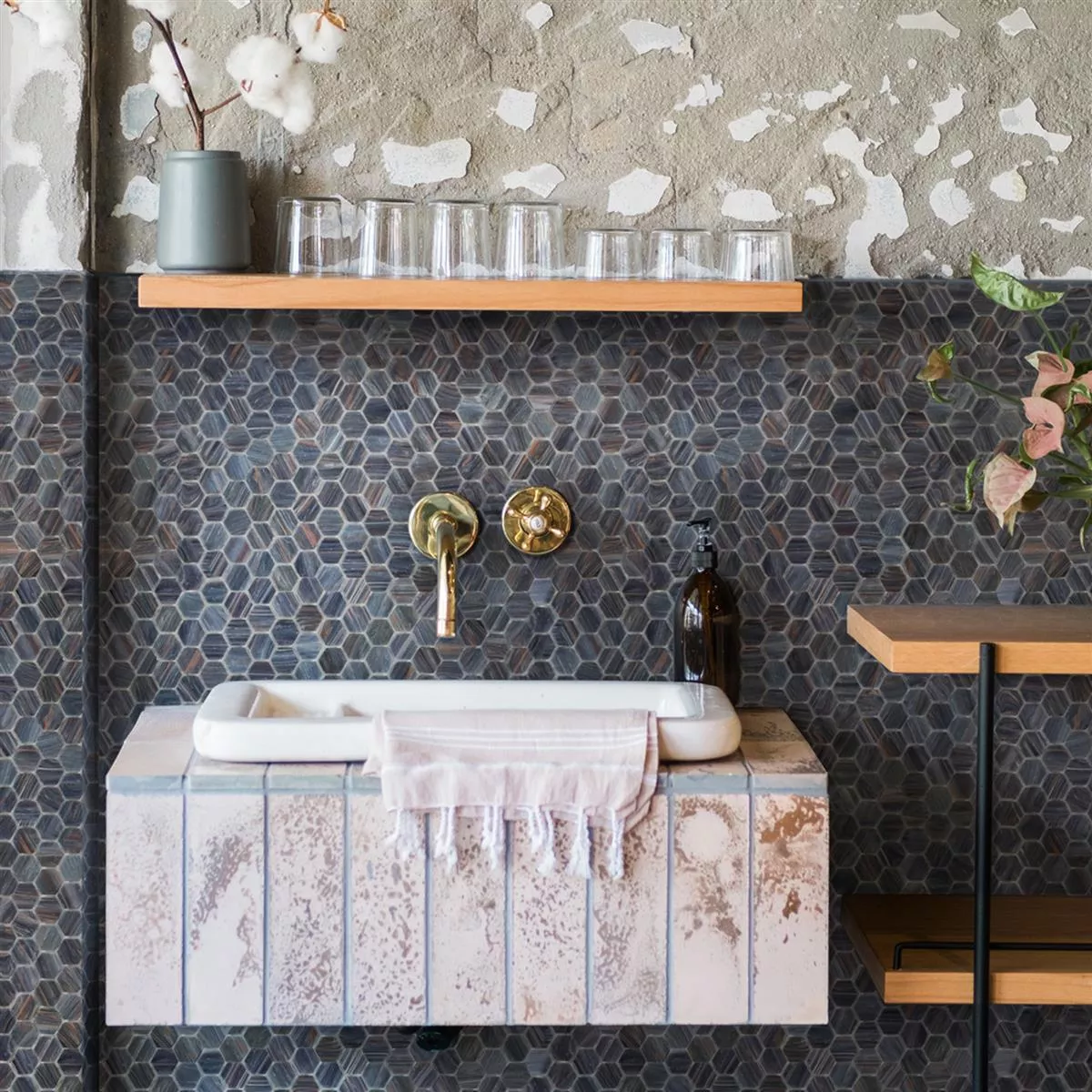 Enten som gulv- eller veggflis, på badet, kjøkkenet eller svømmebassenget, er bruksmulighetene for våre sekskantede glassmosaikkfliser uendelige. Flisen er også ideell for bruk i våtrom som vaskerom og bad, både til bakplater og dusjvegger.