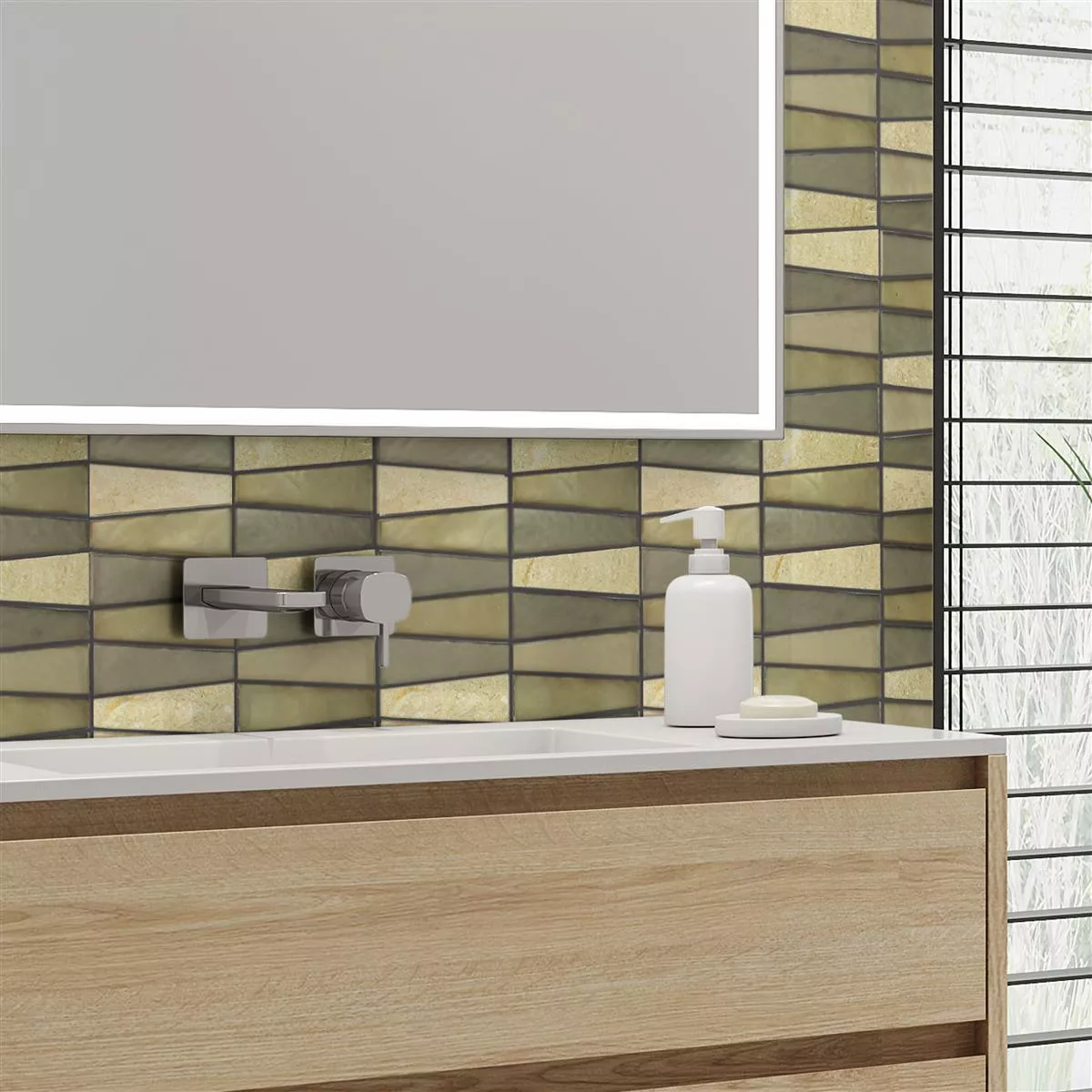 Naturlig varme og tidløs eleganse kommer sammen med de beige brune glass natursteinmosaikkfliser "Sahara Mix". Disse eksklusive mosaikkfliser er laget av en sofistikert kombinasjon av naturstein, marmor og glass i varme beige og brune toner som bringer en koselig og stilig sjarm til rommene dine.