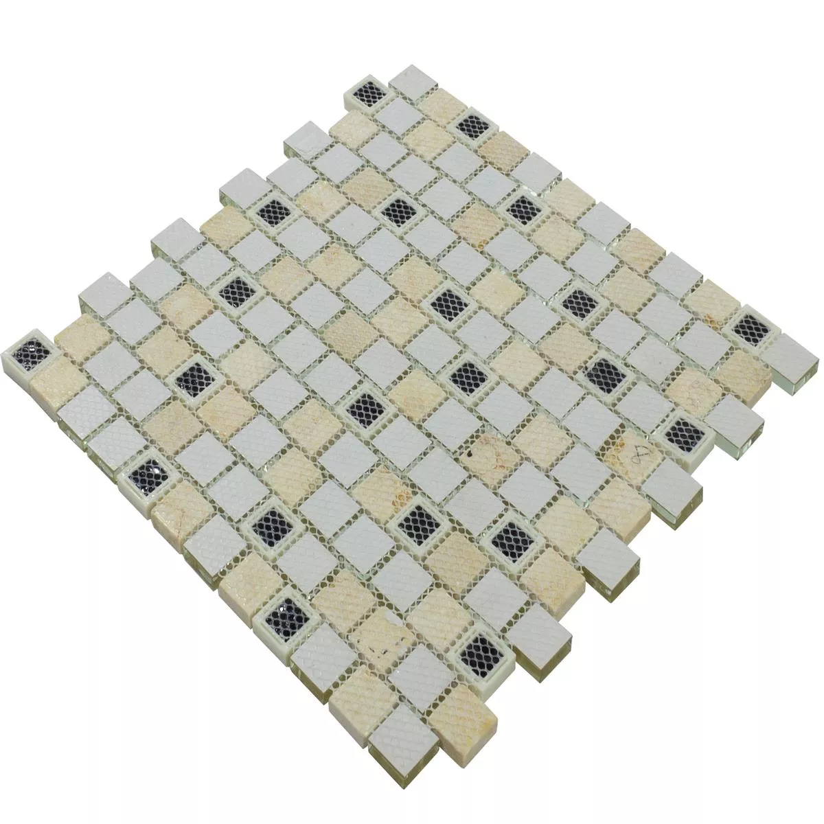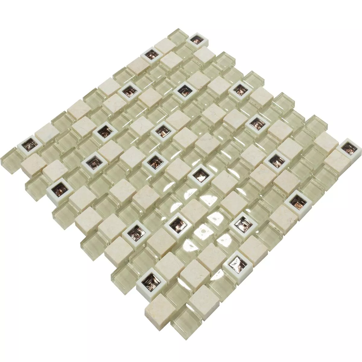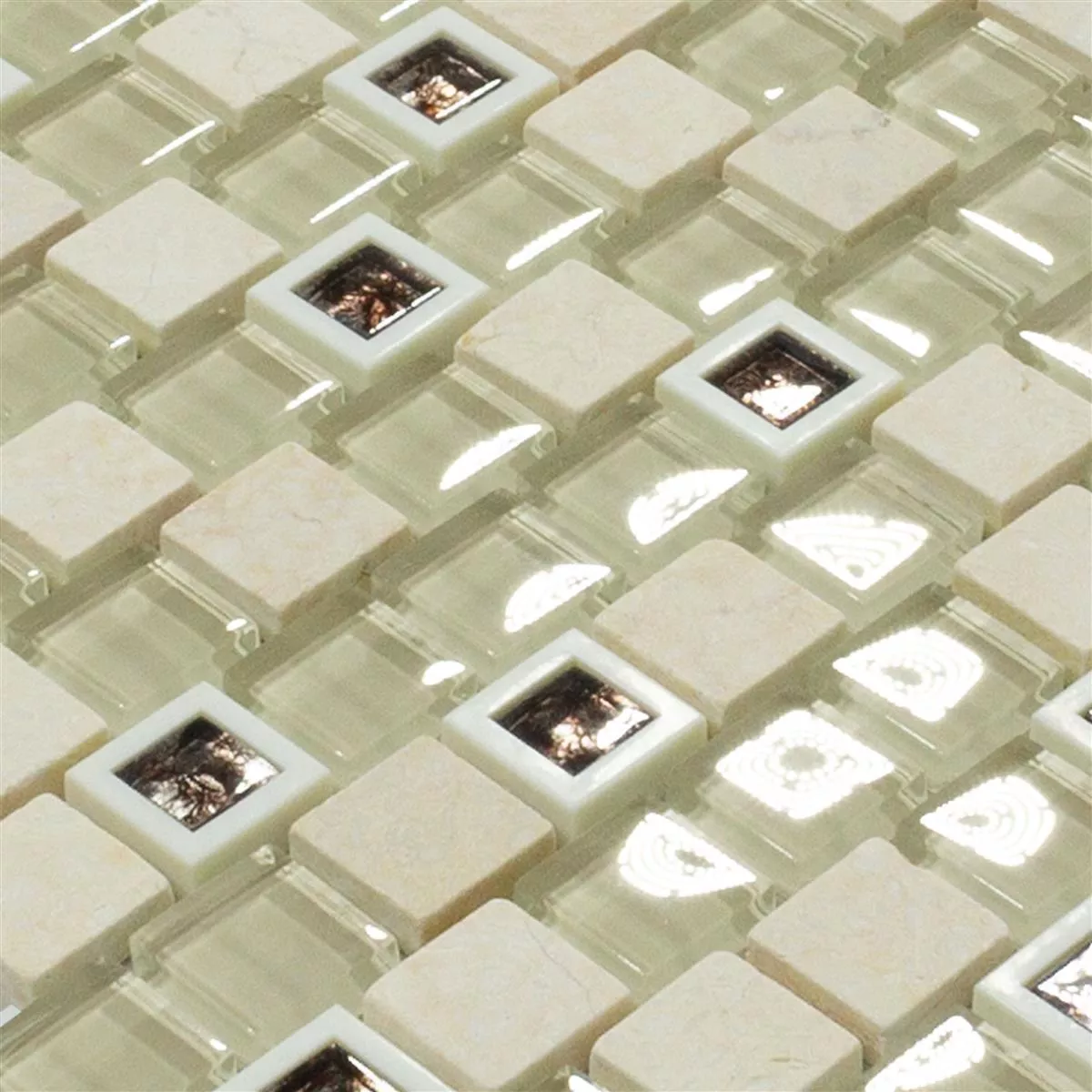 De forskjellige materialene - marmor, glass, plast og naturstein - gir disse flisene en fascinerende tekstur og en skinnende finish. Steinstørrelsen på 23x23mm gir en interessant dimensjon til området.