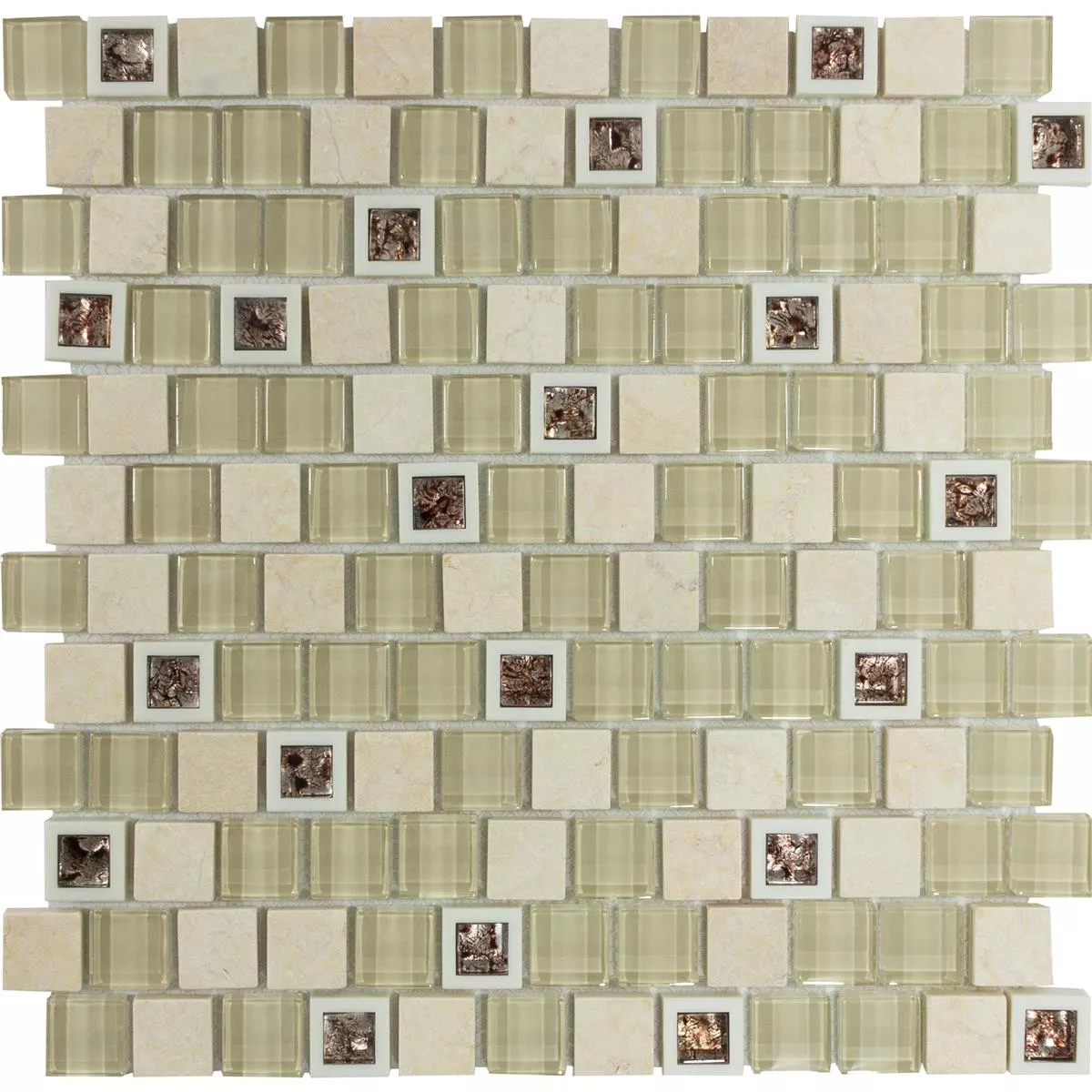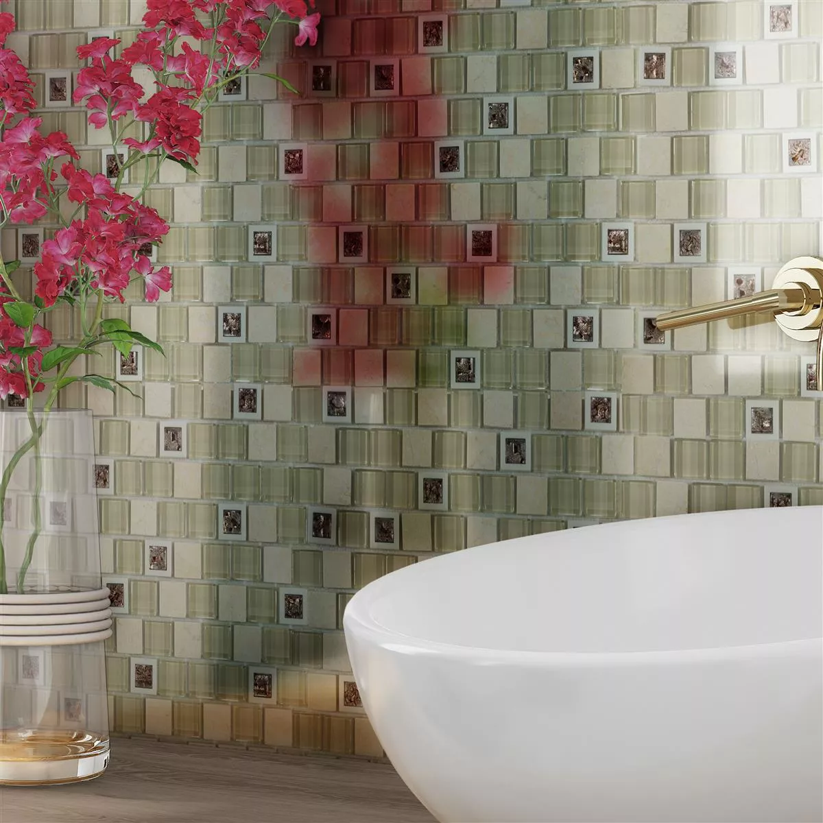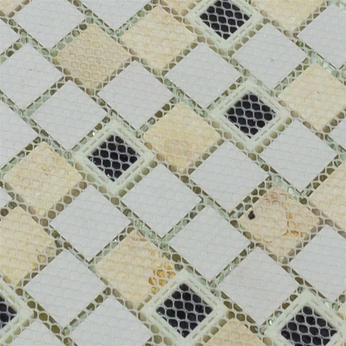 De forskjellige materialene - marmor, glass, plast og naturstein - gir disse flisene en fascinerende tekstur og en skinnende finish. Steinstørrelsen på 23x23mm gir en interessant dimensjon til området.