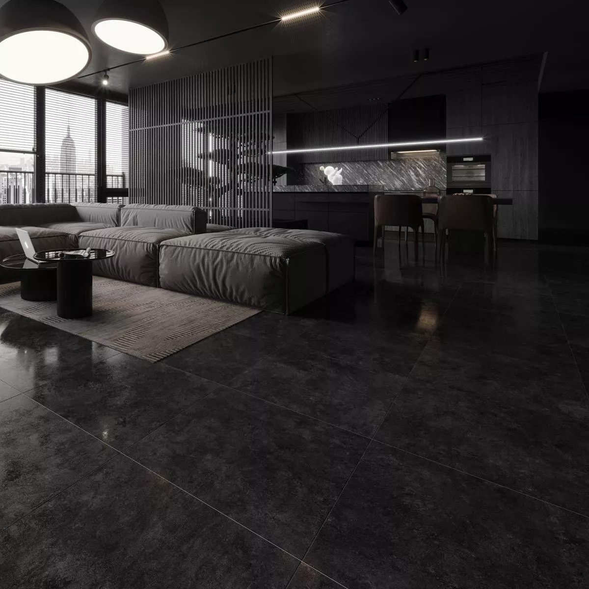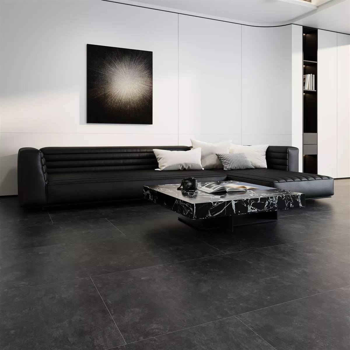 O piso de porcelanato Triton na cor antracite impressiona pelo seu visual moderno de concreto e pela sua versatilidade. Com dimensões de 60x120 cm e espessura de 8 mm, é ideal para uso interno e externo. Seja no banheiro, na cozinha, na sala de estar, no corredor ou na lavanderia, este revestimento se adapta perfeitamente a qualquer ambiente. Particularmente notável é sua adequação para uso em pisos e paredes de chuveiros, embora também possa ser usado como revestimento de parede.