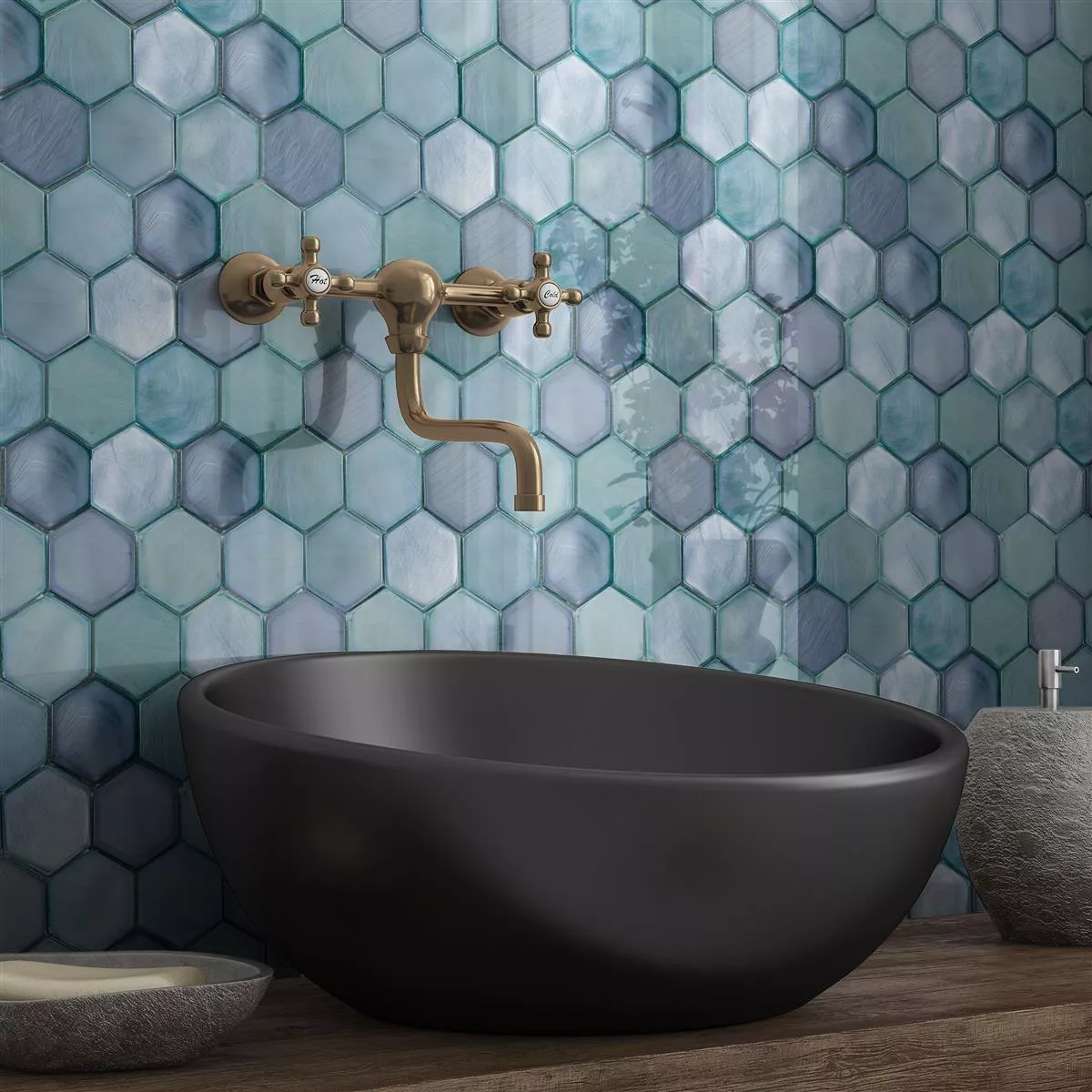 Andalucia Hexagon glasmosaikplattor i havsgrönt presenterar sig som moderna och uppfriskande väggdesignelement för rum som badrum, kök, vardagsrum och dusch. Den livfulla havsgröna ger plattorna en tilltalande och uppiggande atmosfär. Den blanka ytan med pärlemoreffekt ger också plattorna ett elegant utseende.