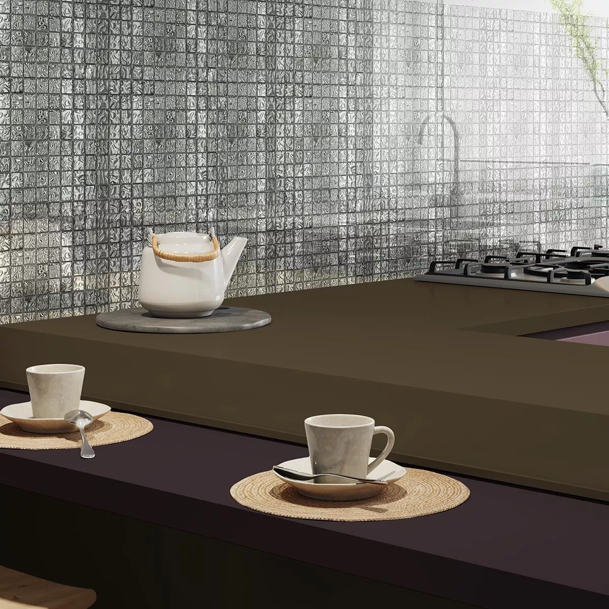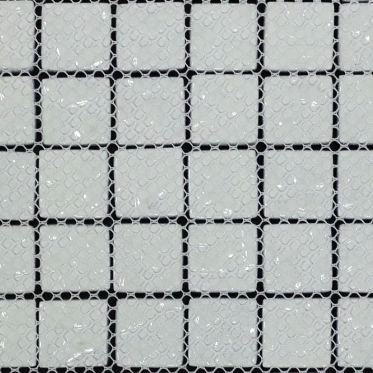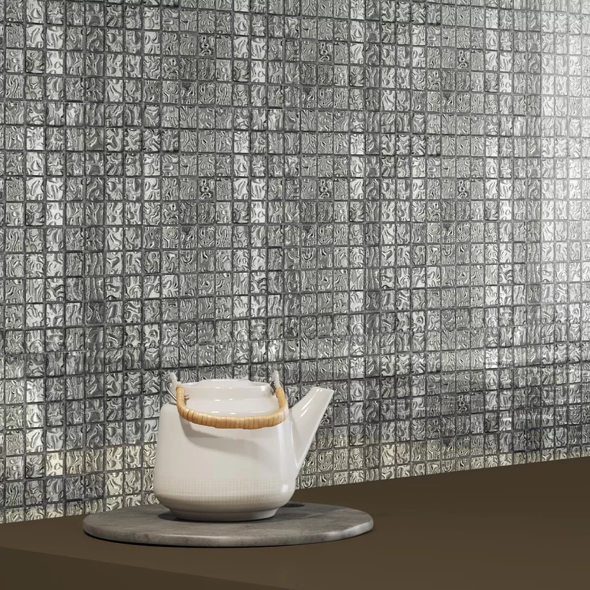 Fördjupa dig i den skimrande elegansen med våra glasmosaikplattor Aquatic Silver. Dessa fyrkantiga mosaik-, vägg- och golvplattor med en stenstorlek på 23x23 mm ger din interiör en tidlös briljans. Den blanka ytan och en fogbredd på 2 mm framhäver det eleganta utseendet.