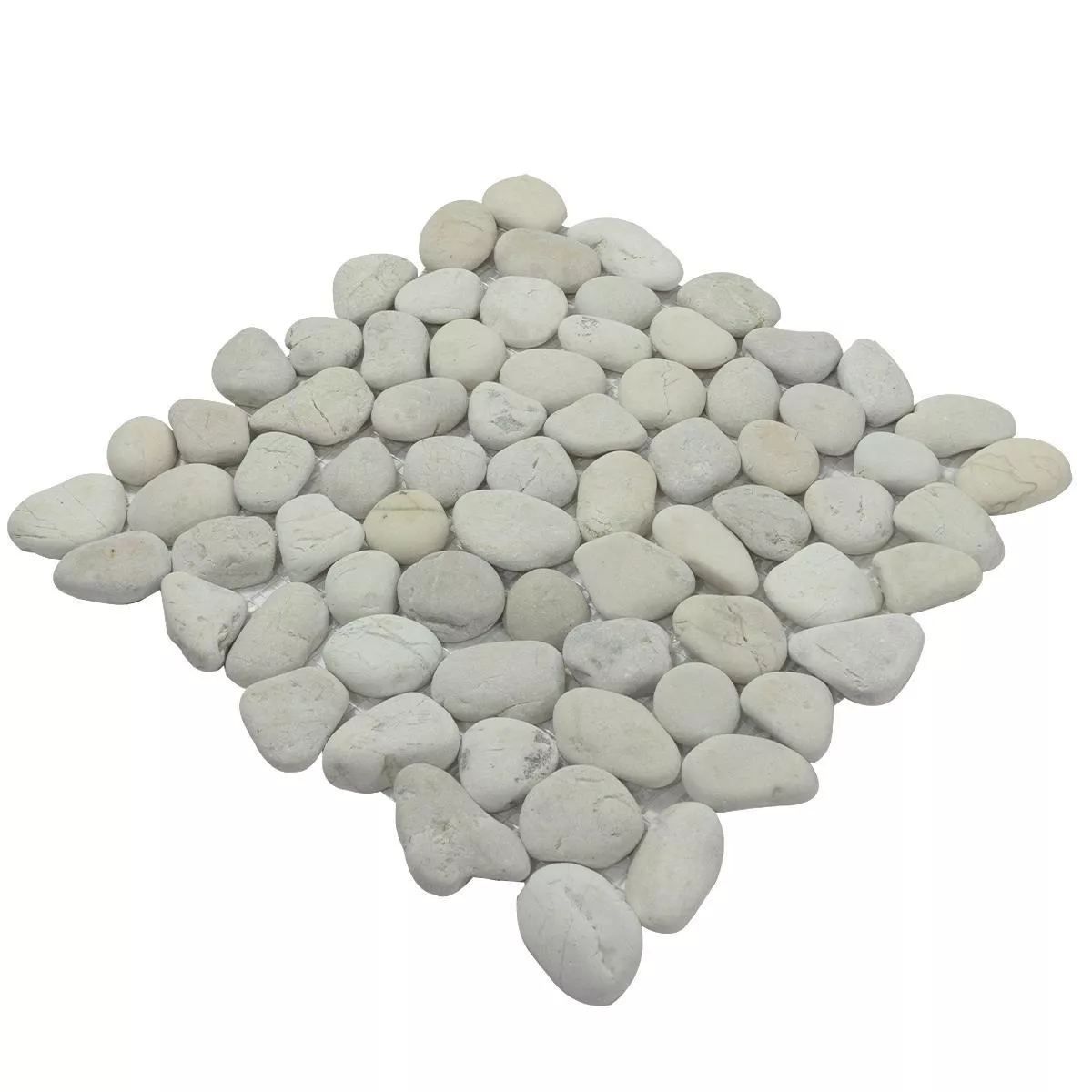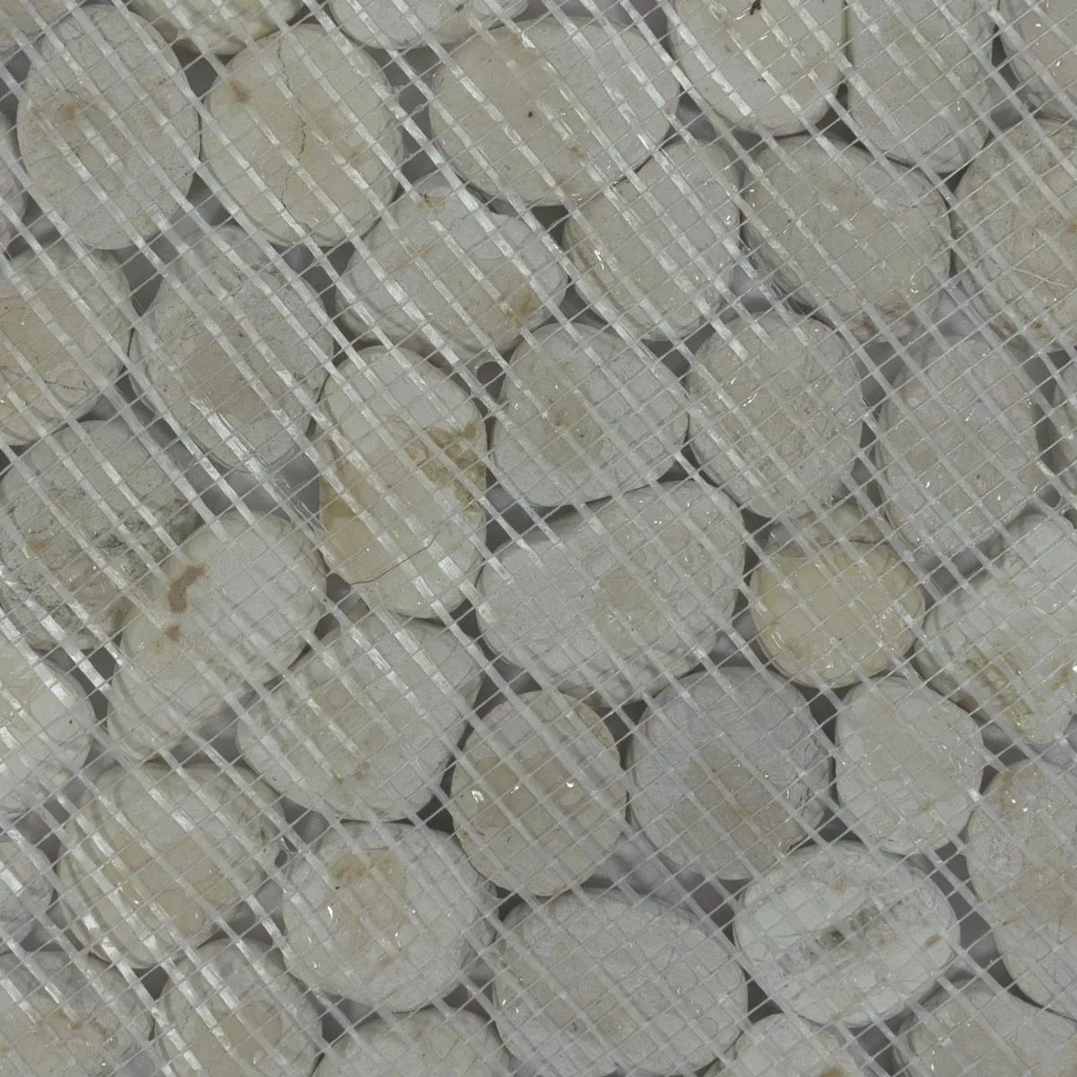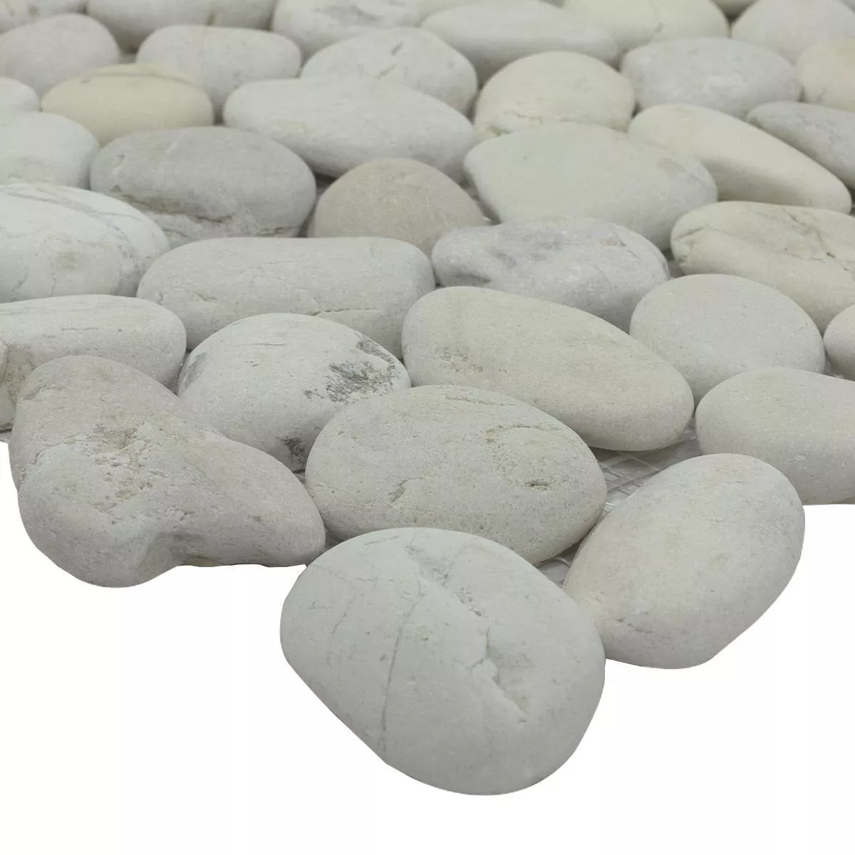 Småstenmosaikplattorna Xanthos White är särskilt vackra som beläggning på väggen eller på golvet. De små plattorna är helt gjorda av natursten. Stenen har kapats och justerats så att alla stenar är ungefär lika stora. Den fängslande chica formen luckrar upp varje badrum. Dessutom är blandningen av båda också tillgänglig. Detta är förmodligen det vackraste sättet att använda dessa stenar. Mosaikplattorna levereras kompletta på bärlager. Detta gör att de kan läggas på önskad plats mycket enkelt, även av lekmän. Stenarna kan läggas på golvet såväl som på väggen. I fuktiga rum bör fogarna definitivt stängas. Som kontrast är lätt injekteringsbruk idealisk här. Detta fungerar särskilt bra med svart kakel, men vilken annan färg som helst kan också användas. Mosaikplattorna är lättskötta och kan behandlas med konventionella rengöringsmedel.