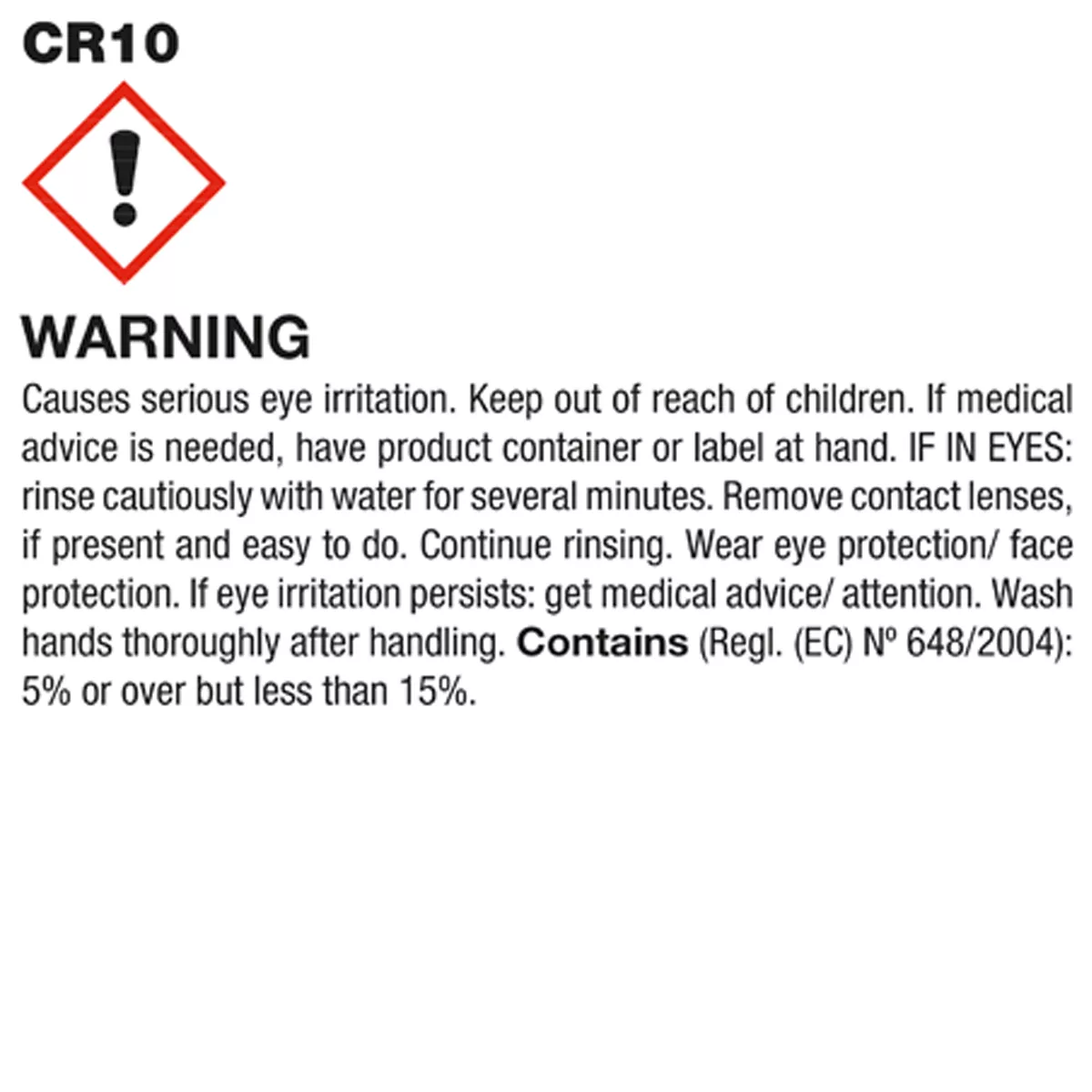 Always test the product on a small area of the surface to check the resistance of the material and to find out the optimal waiting time for cleaning. Do not use on absorbent materials. Do not use on wood. Do not use on methacrylate surfaces. For metal surfaces, test the resistance of the material beforehand.