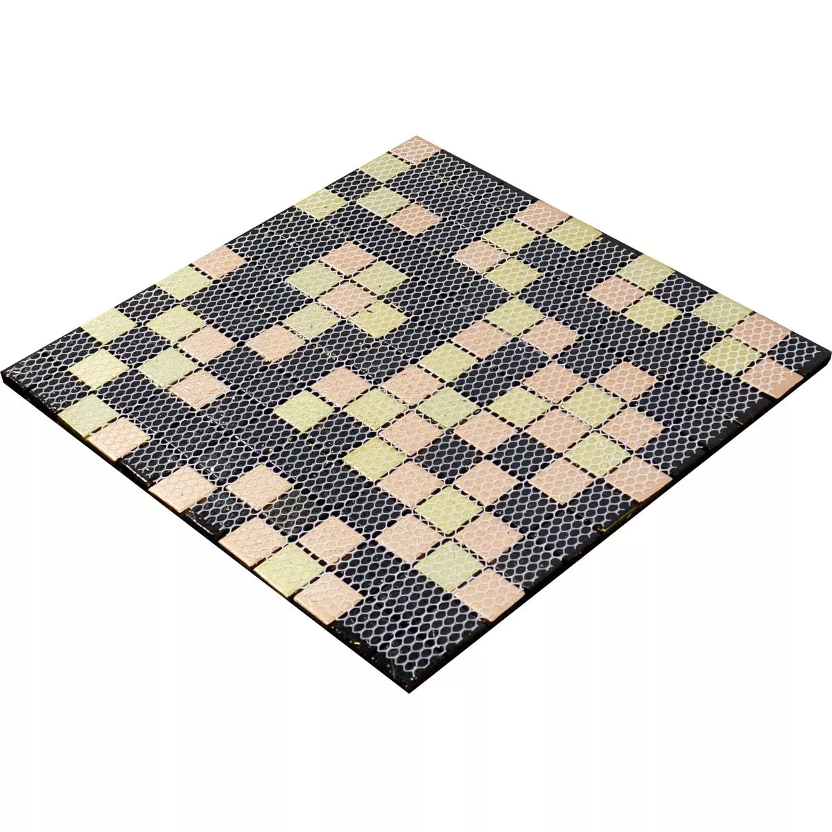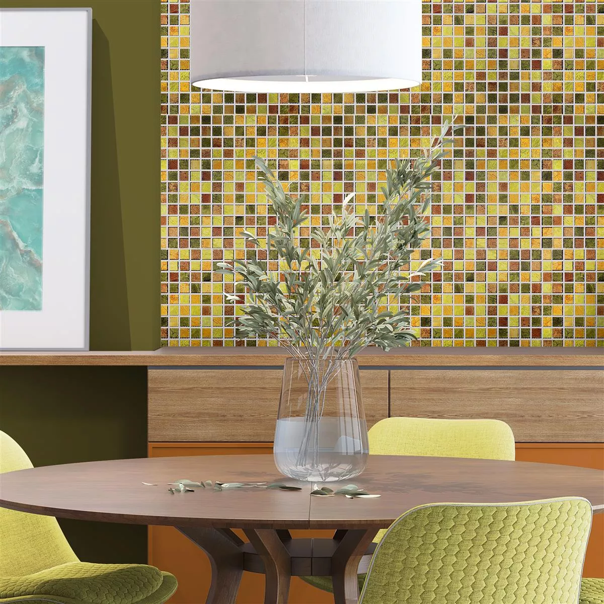 Discover the vibrant variety with our glass mosaic tiles Curlew Yellow Orange Red. These square floor and wall tiles with a stone size of 23x23mm give your interior an exciting textile look in the colors yellow, orange and red. The shiny surface and a joint width of 2mm emphasize the lively optics.