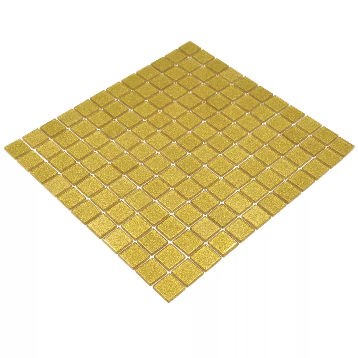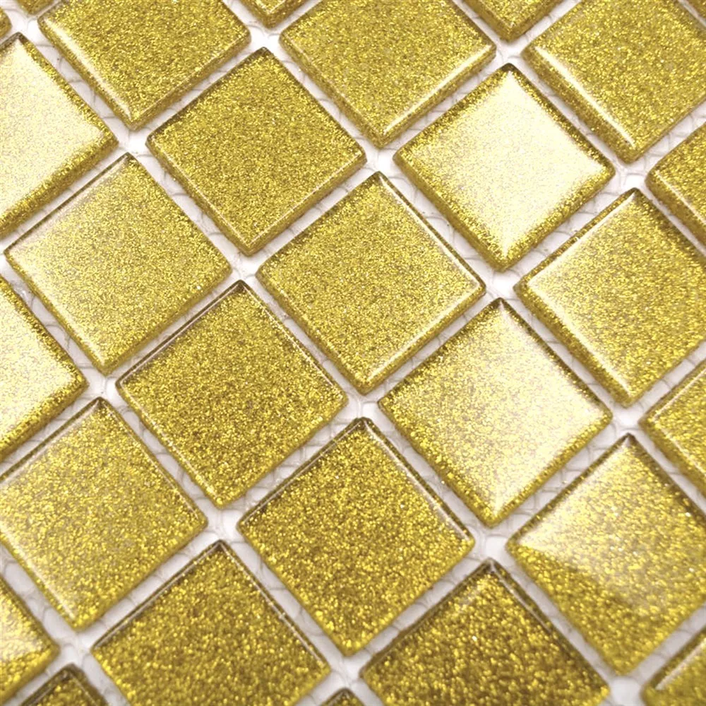 The glass mosaic tile Wichita in gold glitter unfolds its decorative effect not only in kitchens and bathrooms. The decorative, glittering surface also gives sleeping and living areas a special ambience. In terms of hygiene, durability and ease of care, wall tiles are superior to all other cladding. Glass mosaic tiles with a glitter surface are a trend in living room design. With them, both subtle designs with a slightly structured surface and strong contrasts with eye-catching colors can be created.