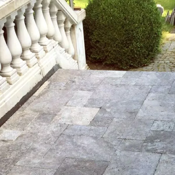 These natural stone tiles Nestor Silver 40.6x60cm made of the robust natural material travertine are cut directly out of the stone. The stone looks slightly silver shimmering. They are excellent for all outdoor areas. The material is slightly structured. This ensures that water on the stones can run off quickly, making the surface hard to walk on quickly. Even in frost, the stone does not become smooth with slight moisture but can still be used.