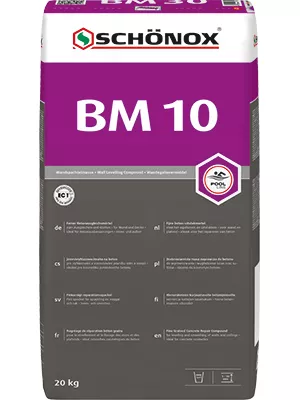 for smoothing, leveling, plastering and repairing wall surfaces made of concrete, aerated concrete, masonry and other cement-bound substrates. Synthetic resin-modified, waterproof and stretchable. Thanks to the latest raw materials and innovative production processes, SCHÖNOX BM 10 produces around 90% less dust when mixed with water. For layer thicknesses of 1-10 mm without expanders. Stretchable up to 20 mm. For indoor and outdoor use.