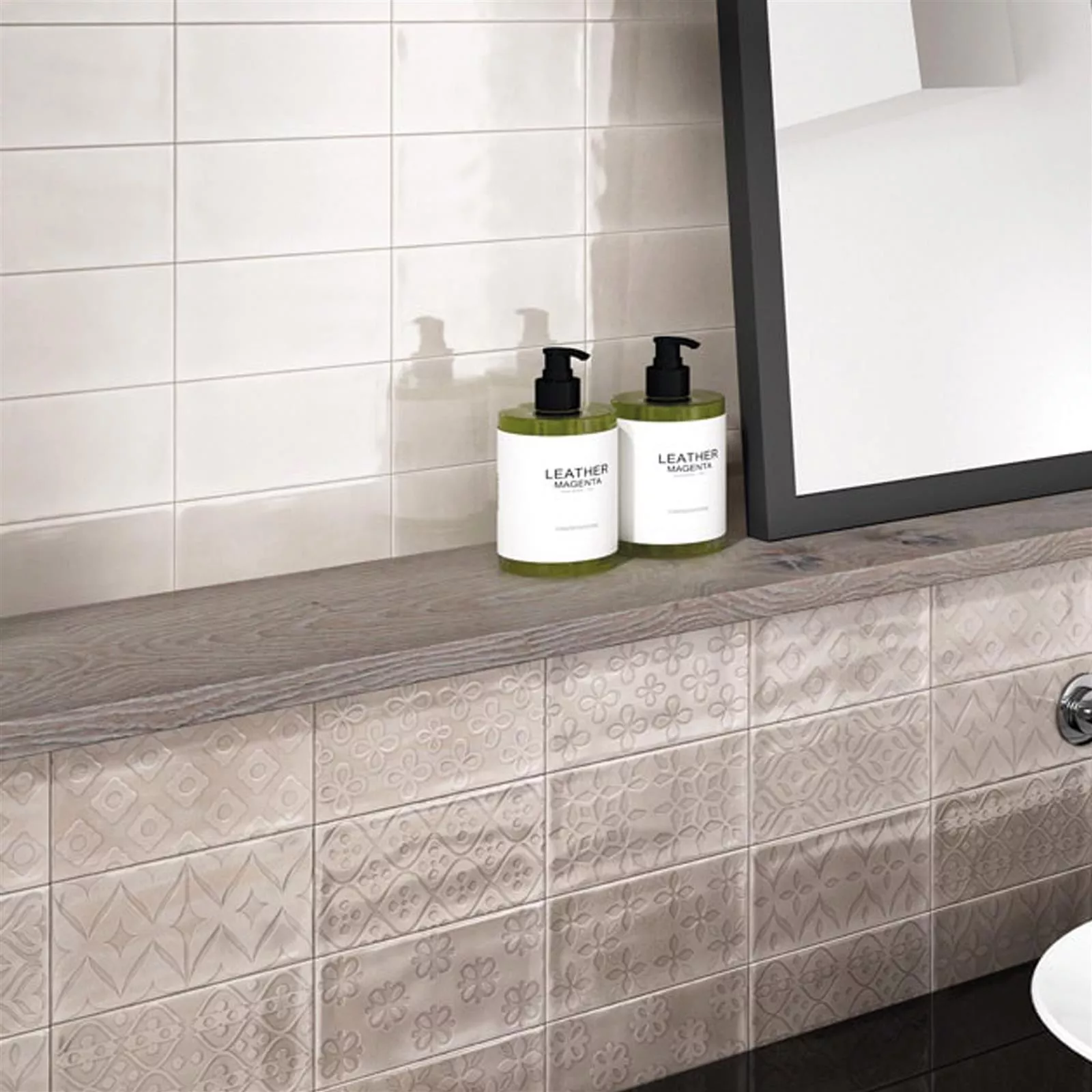 The appealing tile is particularly suitable for wall design in the bathroom and kitchen. The corrugated surface and the natural edge create a restrained originality, the glazed surface gently reflects the light and thus creates an unobtrusive elegance. Due to the large selection of colors, the room can be creatively furnished according to individual wishes. By combining different colors it is possible to set accents, to visually liven up the room or to create a tangible atmosphere. The London wall tile is easy to lay and can be used to furnish large and small areas. Angled corners are also easy to design due to the size of the tiles.